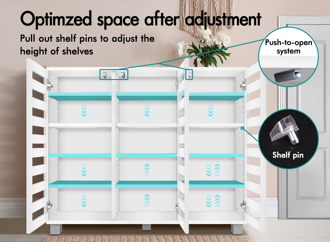 * E1 grade thick particle board* Clean-lined silhouette design* Improved wear-resistant melamine finish* Ventilated slatted door design* Moisture-proof PVC plastic legs* 15 customized shelves* Up to 30 pairs of shoes (depending on footwear sizes)* Spacious cabinet top* Wear-resistant melamine finish* Visible & easy-accessible slatted door design* Height adjustable shelves