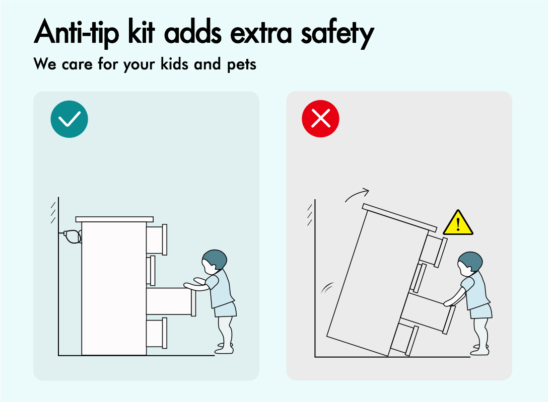 Constructed from solid engineered wood with meticulous craftsmanship, the shoe cabinet leaves not only elegant but also sturdy and made to last. We care for your kids and pets. To add extra stability, an anti-tip kit is equipped for the linkage between the cabinet and the wall.