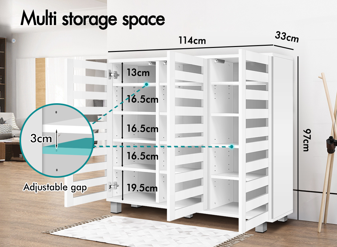 Fitted with three slatted doors and 15 customized shelves giving this piece enough space for up to 30 pairs of shoes ranging from slippers to high boots. Slits within the doors enable air circulation and prevent mould growth on your shoes.