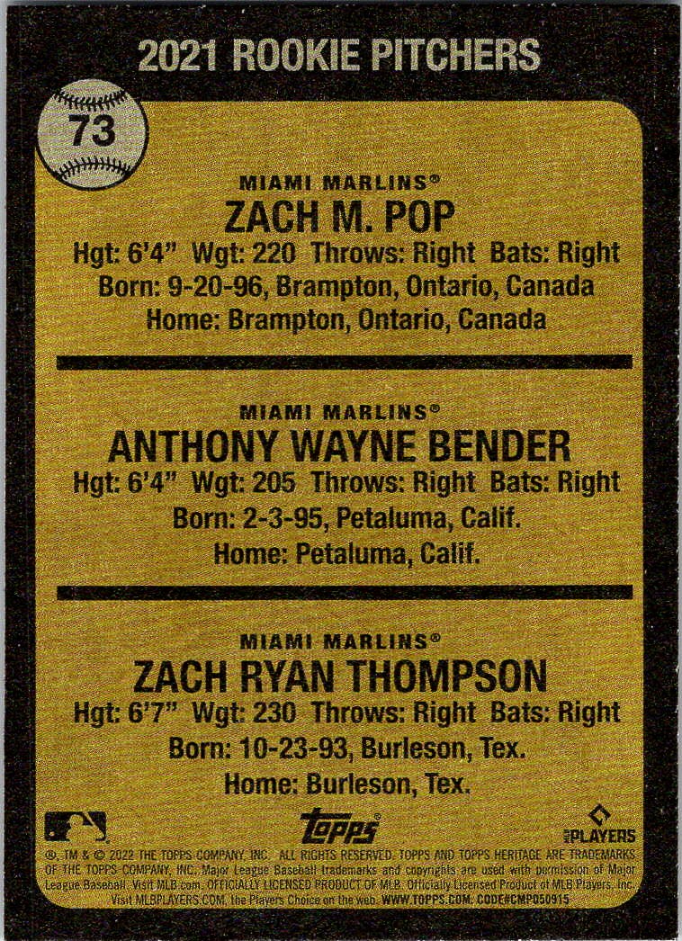 | Description: | Zach Pop/Zach Thompson/Anthony Bender | | Category: | Baseball | | Year: | 2022 | | Product: | Topps Heritage | | Team: | Miami Marlins | | Card Number: | 73 | | Rookie: | Yes | | Dimensions: | 3¼" x 2¼" |