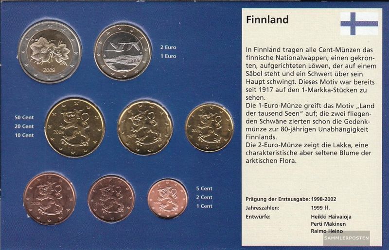 Münzen Finnland 2009 Stgl./unzirkuliert Kursmünzensatz 2009 EURO-NachauflageProdukt: Münzen Gebiet: Finnland Ausgabeanlass: 2009 EURO-Nachauflage Titel: 2009 Stgl./unzirkuliert Kursmünzensatz Ausgabejahr: 2009 Erhaltung: Stgl./unzirkuliert