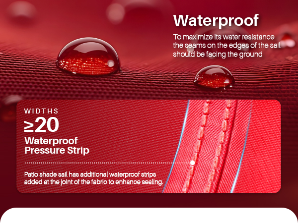 - Strengthen Waterproof: Patio shade sail has additional waterproof strips added at the joint of the fabric to enhance sealing. To maximize its water resistance the seams on the edges of the sail should be facing the ground