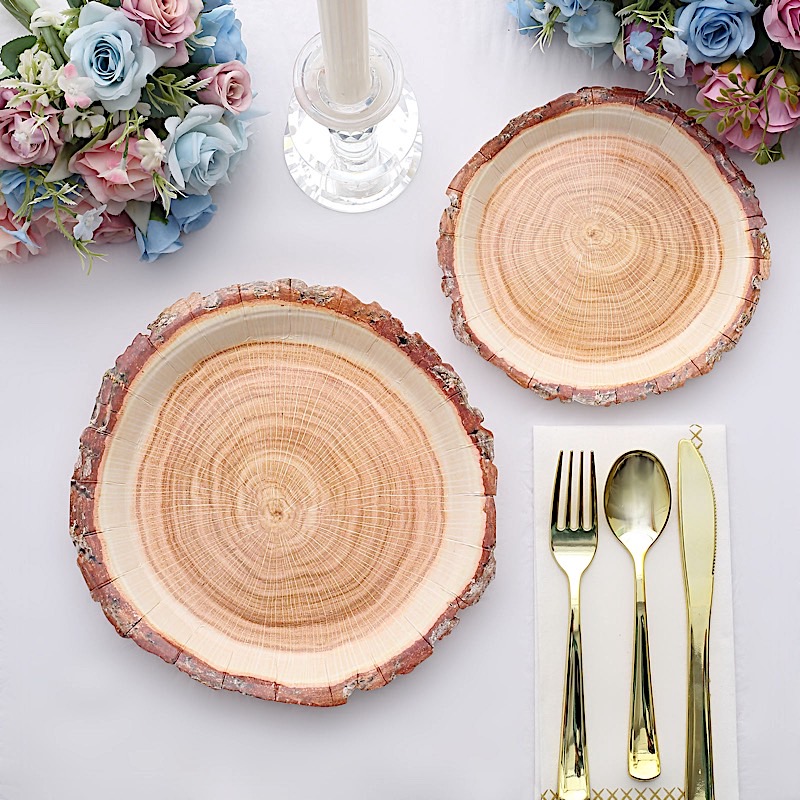 Entertainment just got easier. Serve your guests using these practical yet stylish plates and let your great food speak for itself! High quality paper plates with a rustic wood slice printed design will make any dinner or lunch look extraordinary. Great alternative to plastic plates and a perfect choice for fine dining occasions where fast cleanup is a must! Use these paper plates for country-style weddings, bridal showers, baby showers, birthday parties or any special events.