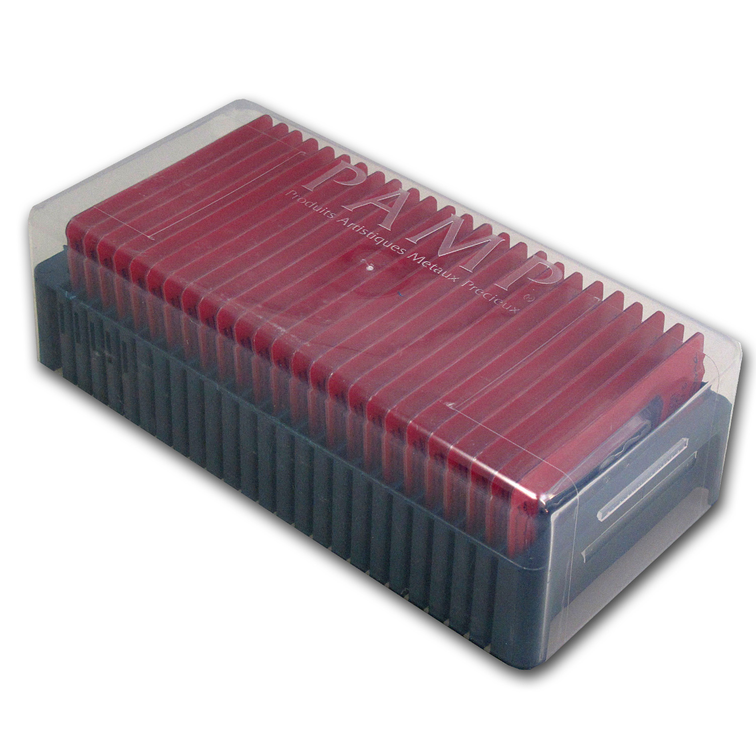 - Each silver bar is encased in beautiful red assay with a card that verifies the bar has been approved by a certified assayer. Multiples of 25 come in an original PAMP box.