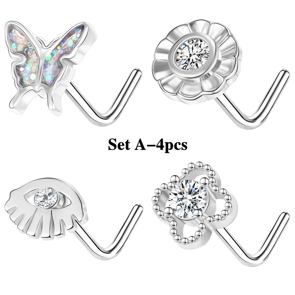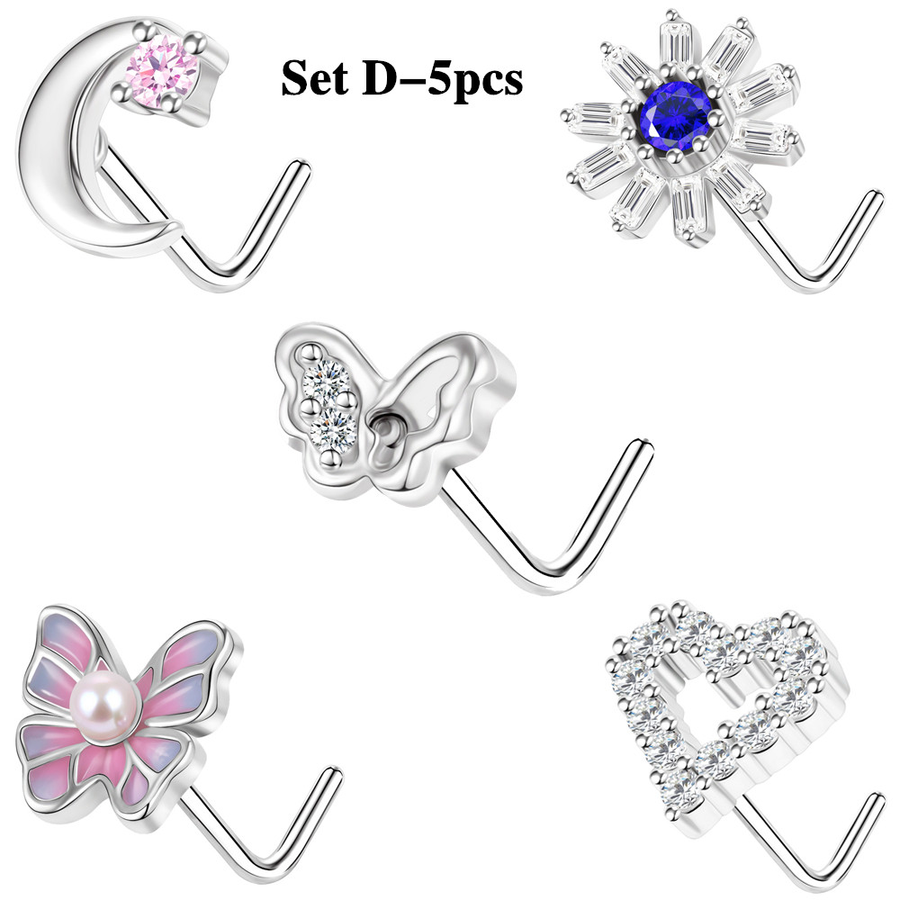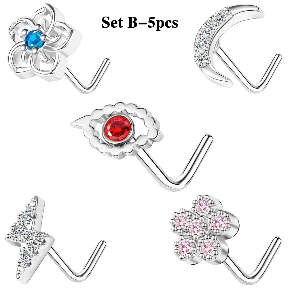 4/5Pcs 20G Stainless Steel Nose Rings Stud L-Shape CZ Nostril Piercing Jewelry