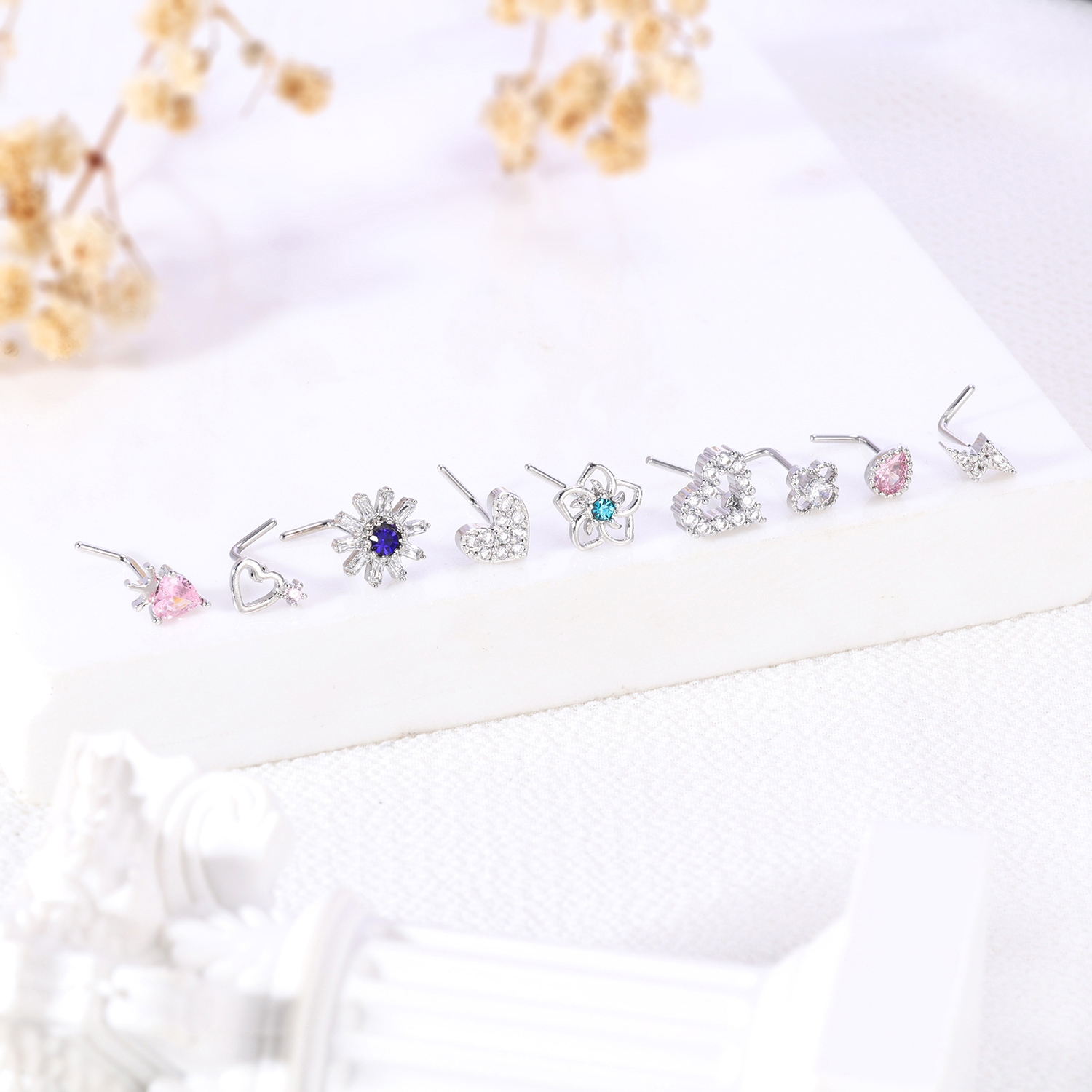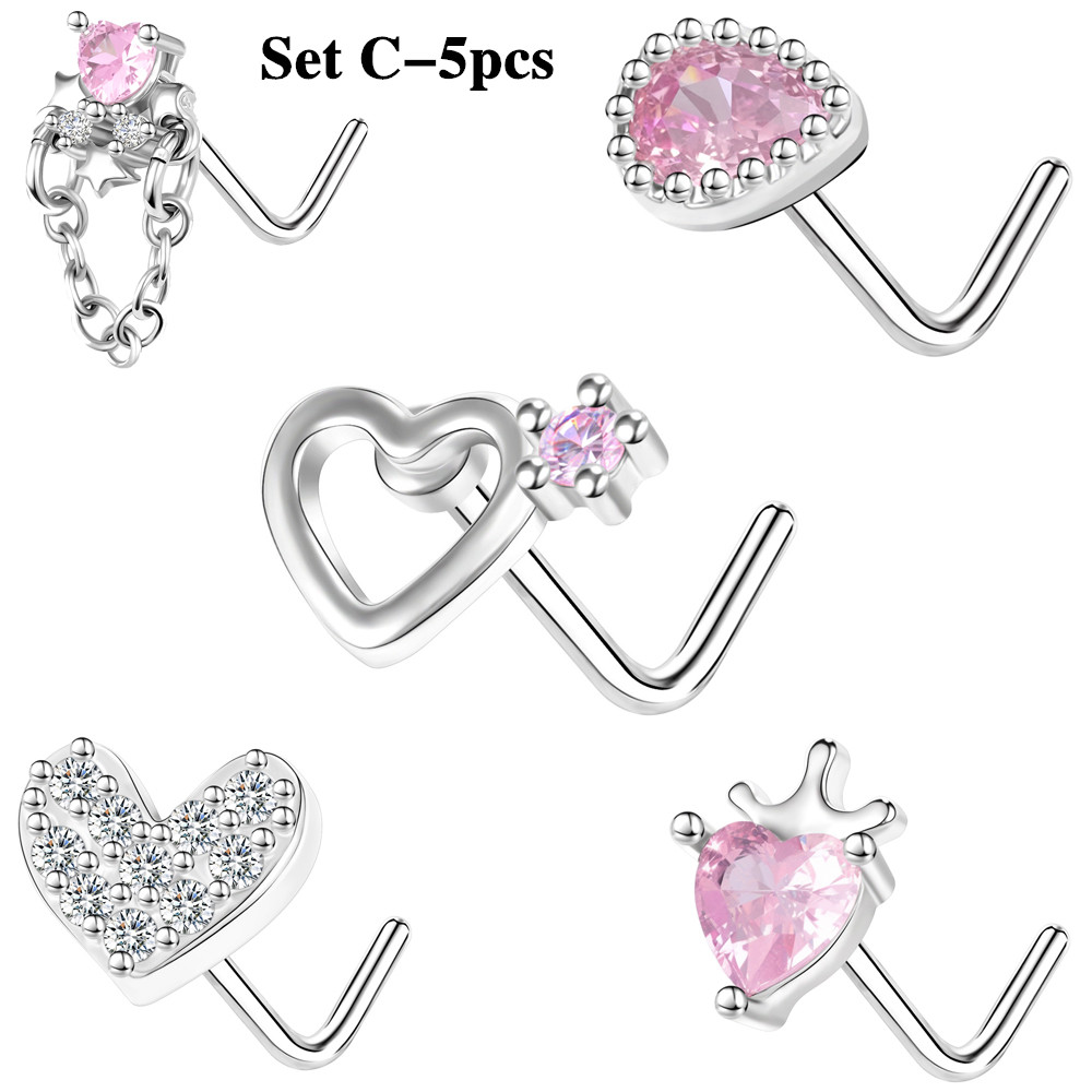 5/6PCS 20G Stainless Steel Nose Piercing Heart CZ Crystal L-Shaped Nose Studs