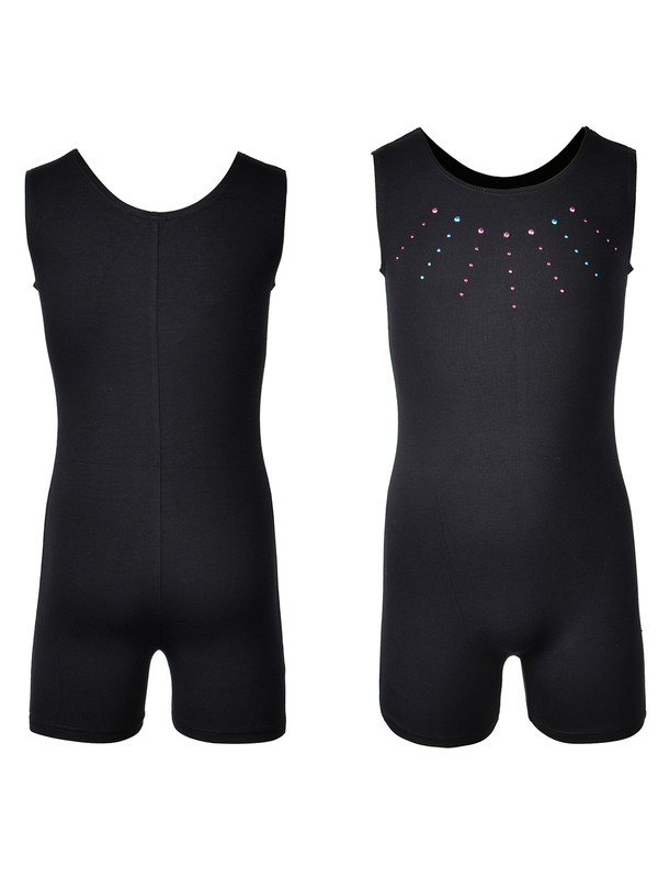 Solid color, V neck, backless, shiny rhinestone decor, sleeveless skirted leotard.