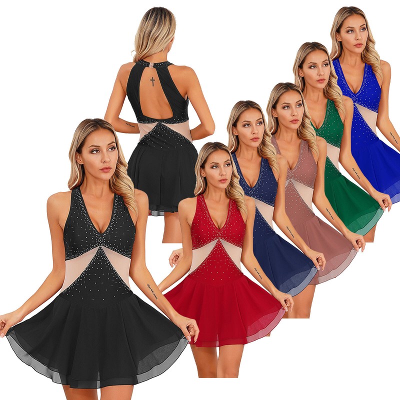 Women V Neck Rhinestone Dance Dress Figure Skating Skirted Leotard Gymnastics Dresses.