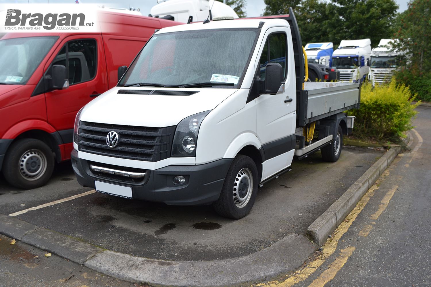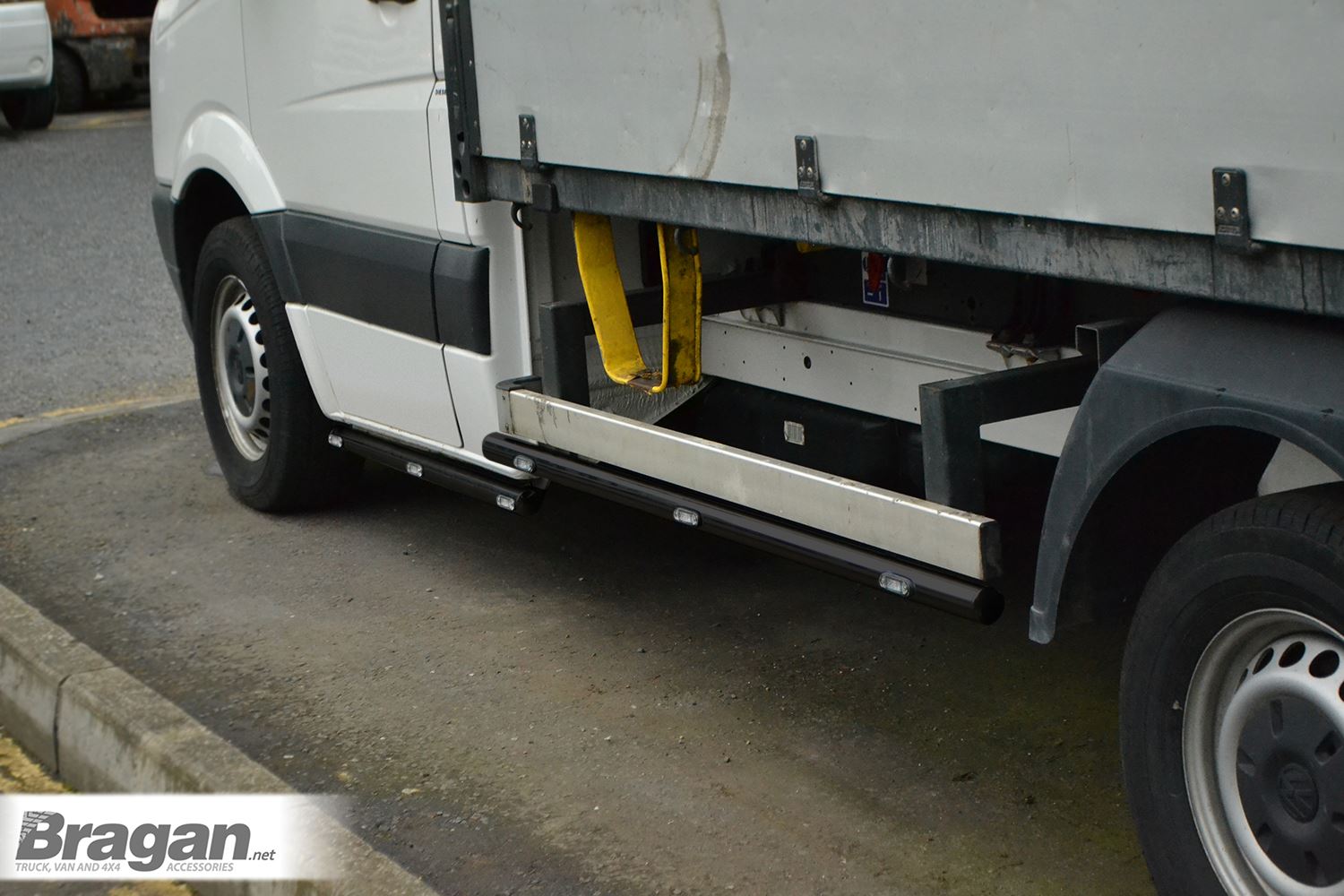High quality Black Powder Coated Stainless Steel Step Bars with Amber LEDs (x3 per bar) to suit Volkswagen Crafter SWB (Short Wheel Base) Chassis Cab (2006 - 2014 model). This top of the range bar will have your truck looking top spec at a fraction of the cost of the genuine items but with the same high quality.