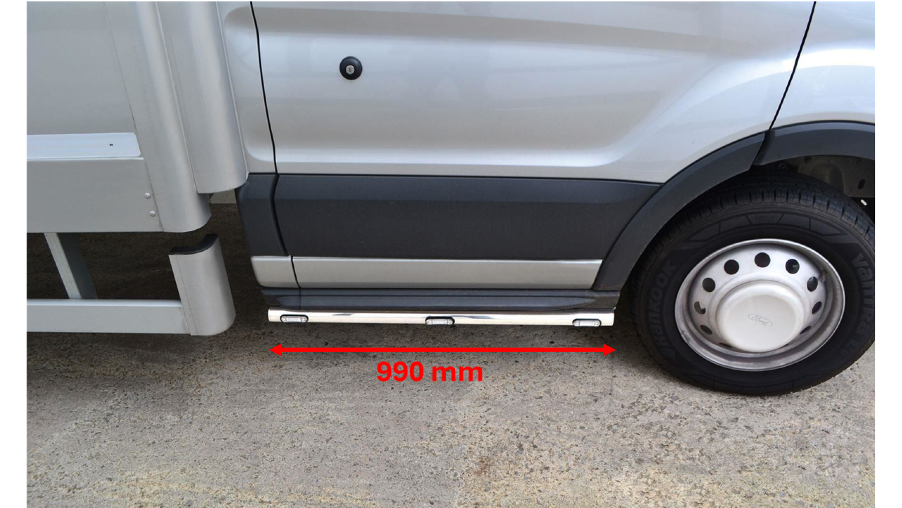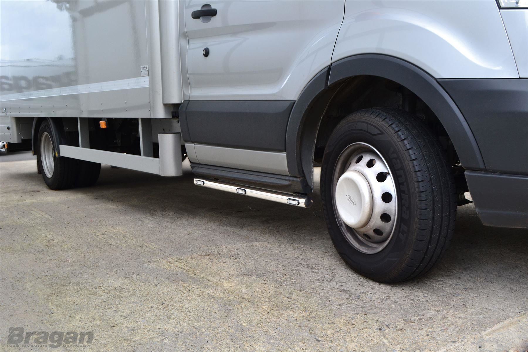 High quality Stainless Steel Side Bars with 3x Amber Flush LED Markers to suit Ford Transit MK7 Chassis Cab / Tipper / Pickup (2007 - 2014 models). These top of the range side bars will have your vehicle looking top spec at a fraction of the cost of the genuine items but with the same high quality.