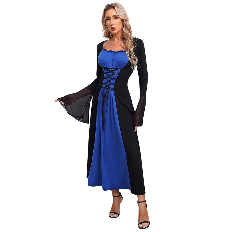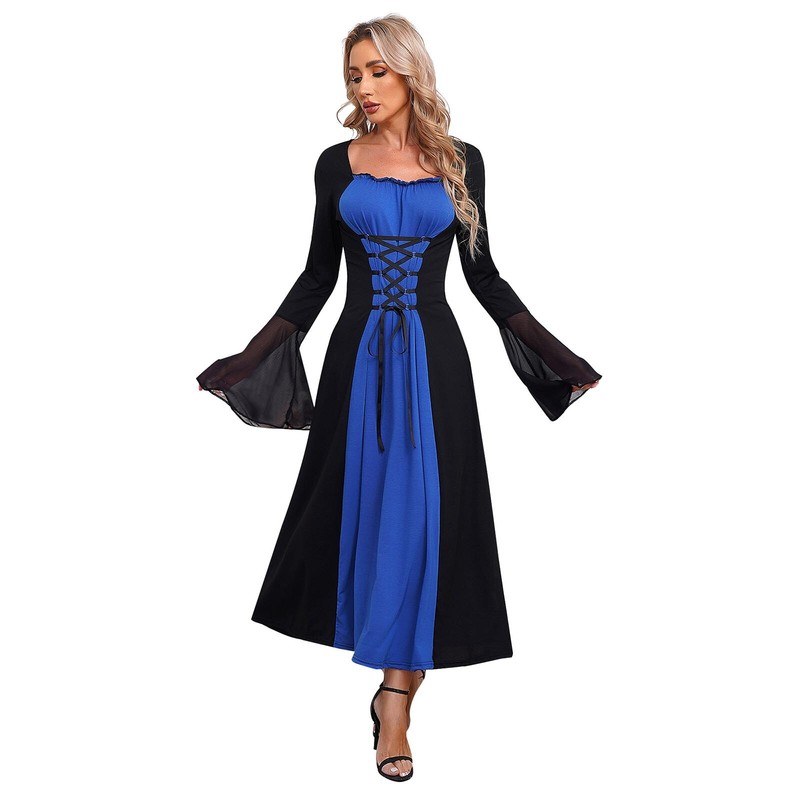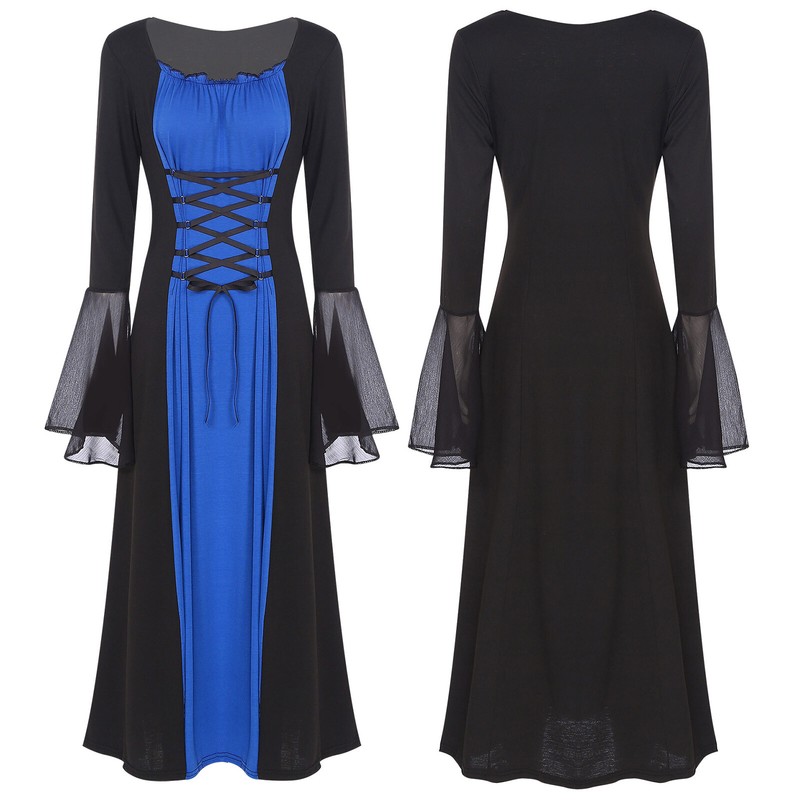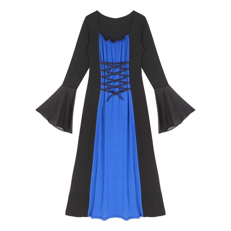 Long flare sleeve, there is lacing on the front of the dress which can be adjusted to fit your figure.