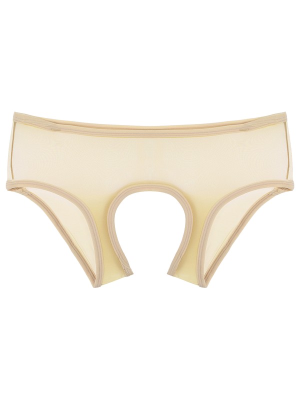 Front with see-through lace design, open butt and minimal coverage.
