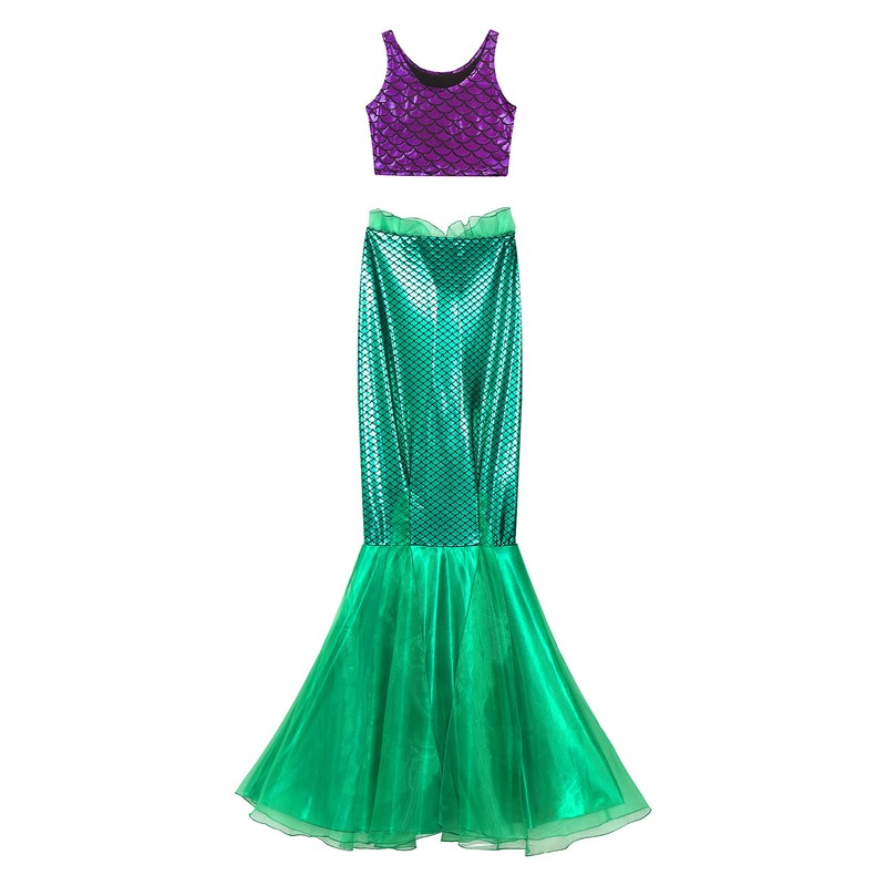 Designed with classic fishtail skirt silhouette, elastically high waist, cascading ruffle, fish scale print and metallic shiny surface, making you charming.