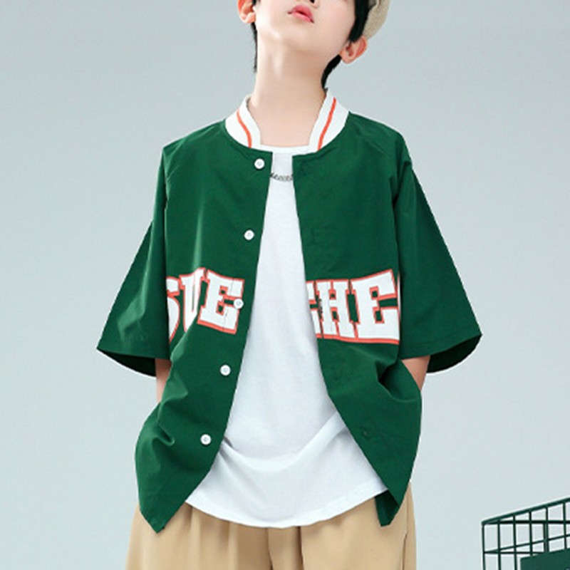 Half sleeve shirt jacket for boys and girls, letter print, ribbed neckline, button closure for easy wearing.