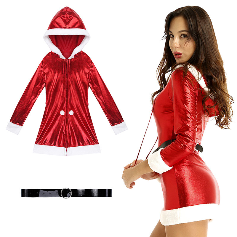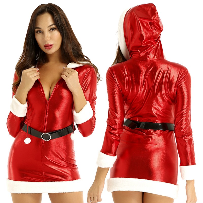 Women adults Mrs Santa costume for Christmas cosplay party dress up, front zipper closure.