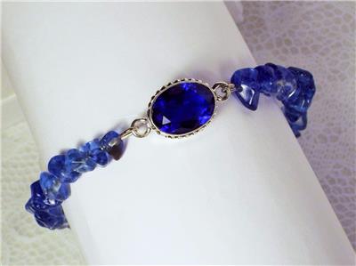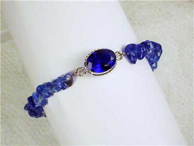 Brilliant blue tanzanite gemstone set in vintage sterling silver on blueberry quartzite beaded bracelet. Includes gift box.