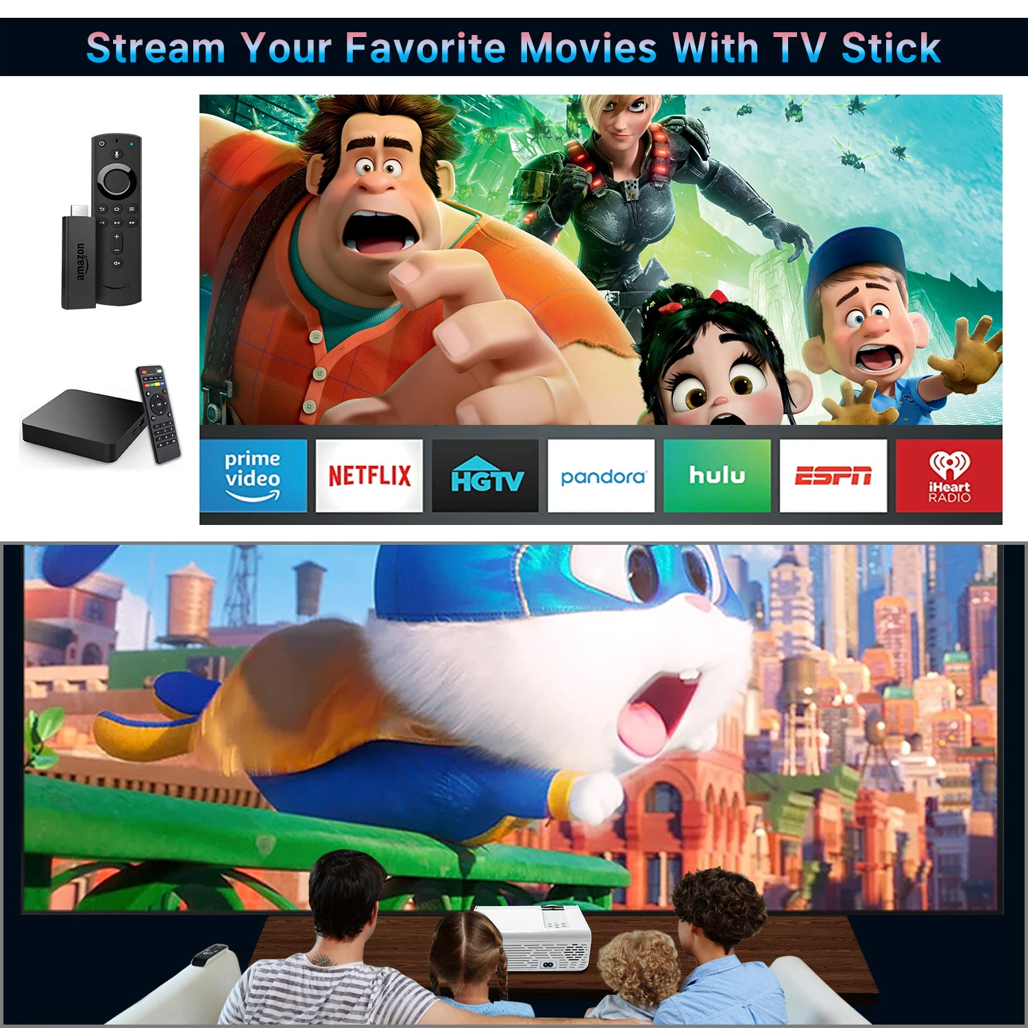 À l'exception de la connexion sans fil wifi, il est également équipé d'un port HDMI, d'un port USB, d'un port AV et VGA, d'un port audio de 3.5mm, qui vous permet de vous connecter avec TV Stick / Roku Streaming Stick / Chromecast / Laptop / DVD / PS4 / Xbox / TV Box et ainsi de suite.