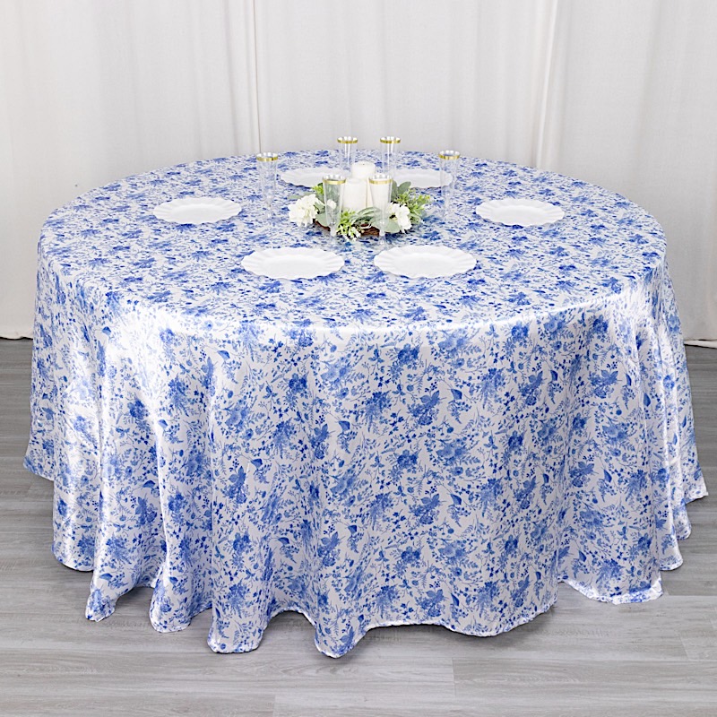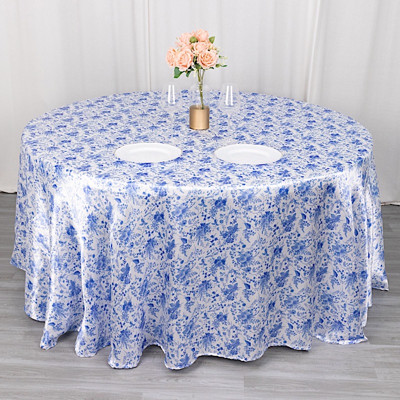 120 in White Satin Round TABLECLOTH Blue Floral Print