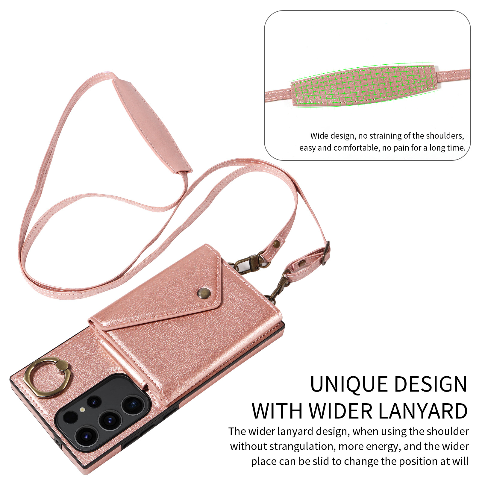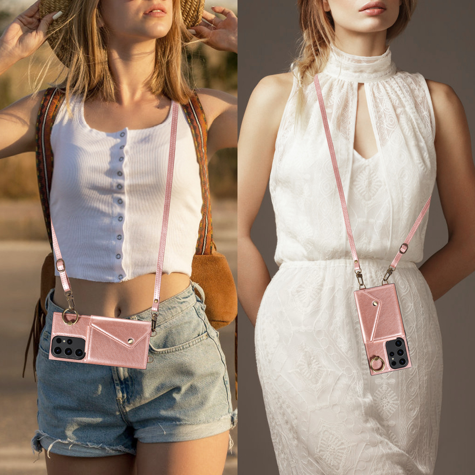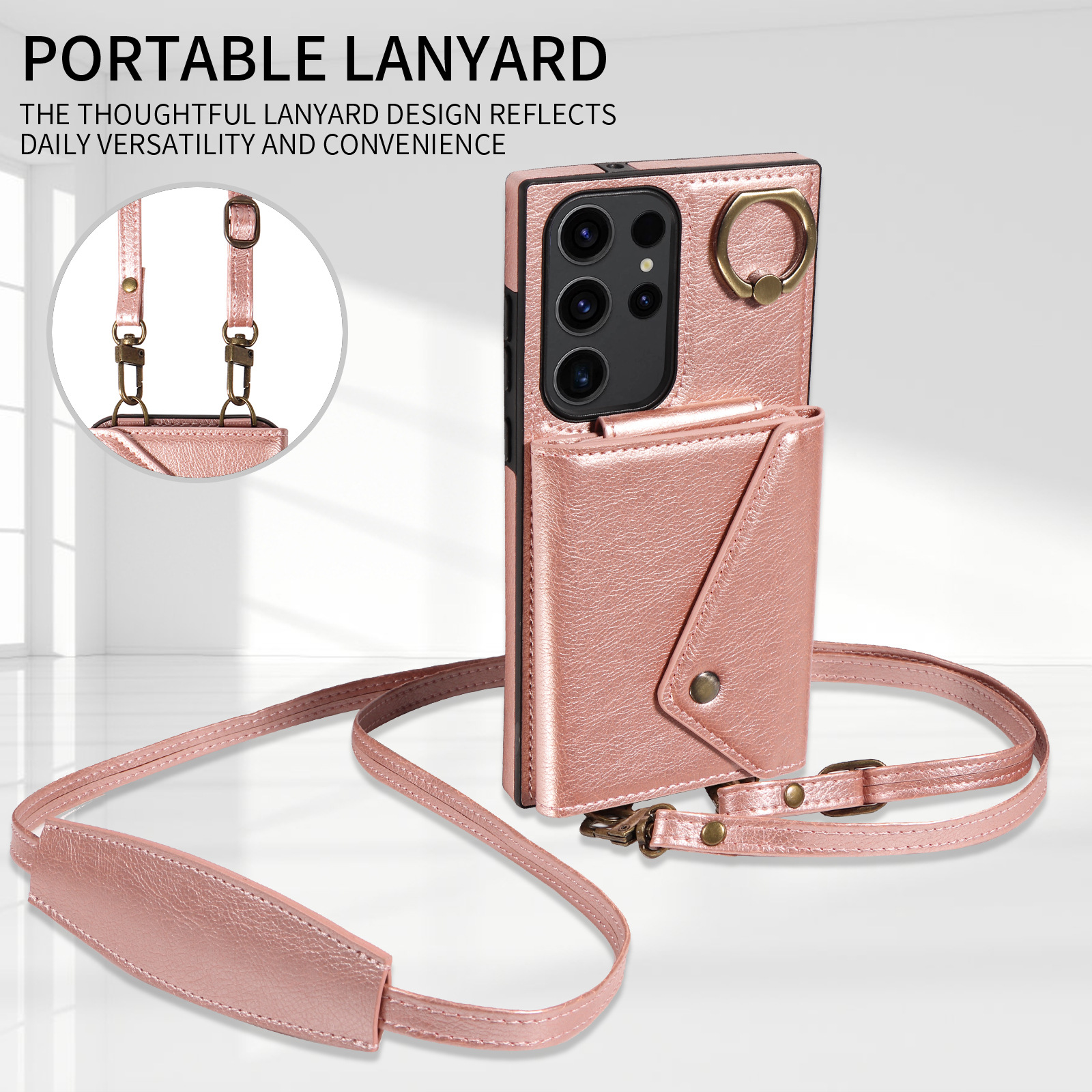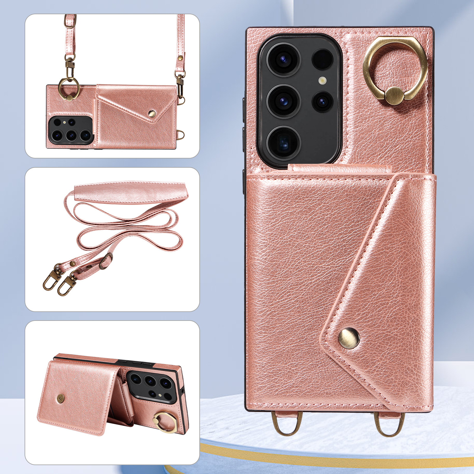 PU Leather Ring Kickstand Card Holder Wallet Case Shockproof Bumper Phone Cover with Crossbody Strap For Samsung Galaxy S23 Ultra S23 FE S22 Plus S21 FE
