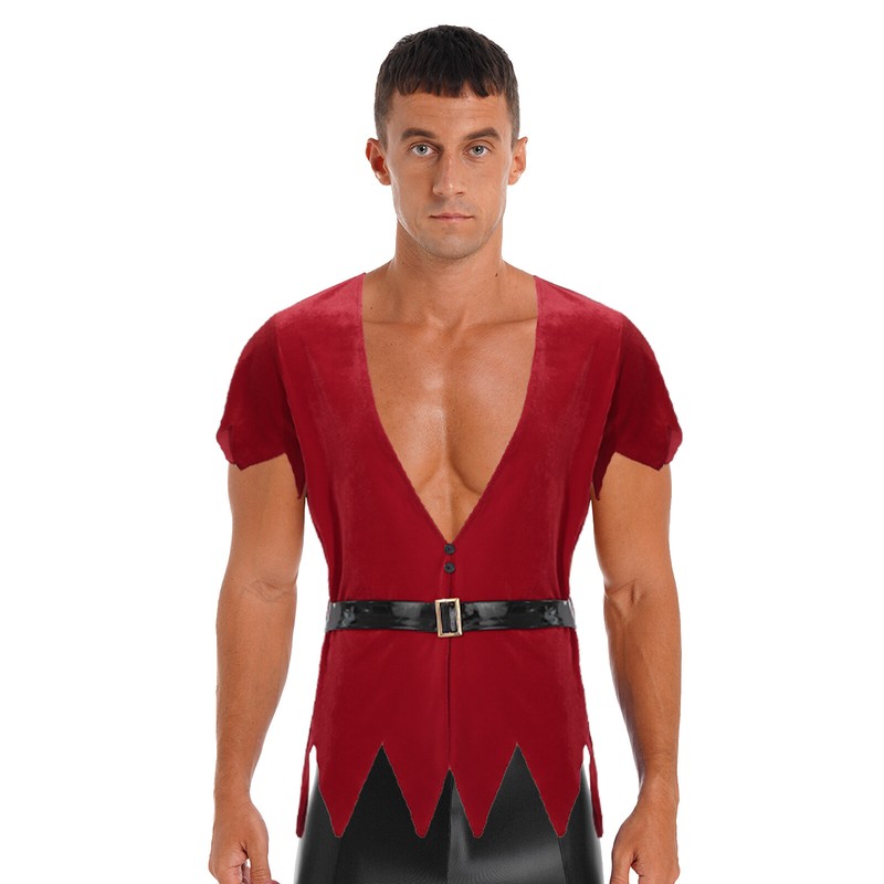 Mens Christmas Outfits Role Play Costume Velvet Deep V Neck Short Sleeve Tops with Belt.