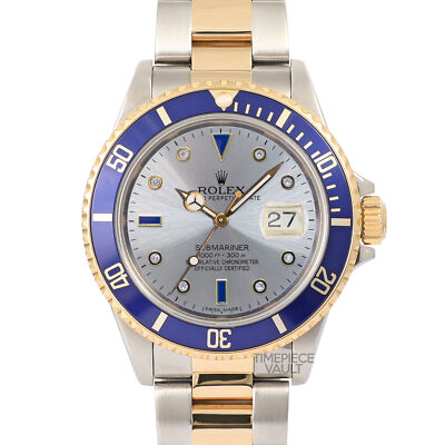 Introducing this authentic pre-owned Rolex Submariner Reference 16613. This watch has undergone recent servicing and polishing, ensuring it's in top-notch condition. This sporty and elegant timepiece is designed for men and features a 40mm stainless steel case with a screw-on back. The watch has a black luminous dial and a Rolex 18k Gold Bezel with a custom non-Rolex black aluminum insert (we can also make it ceramic upon request). The bracelet combines stainless steel and 18k yellow gold. It has an easy-to-use Oyster Perpetual bracelet and a secure steel folding clasp with flip lock.