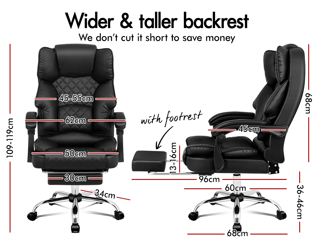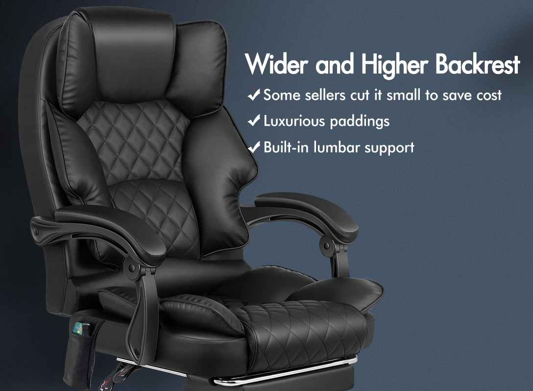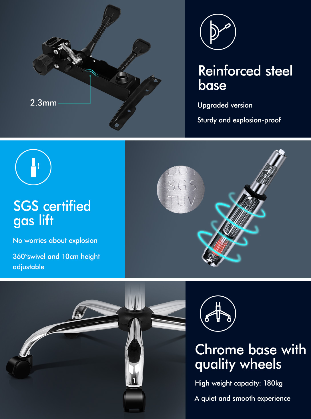 A stylish chrome base with TUV certified casters, Intertek approved PU leather, SGS approved Gas-Lift system and tilt function, delivering absolute five star luxury. And unlike some other sellers, we have no compromise on materials used. We guarantee that no cycled foams are used, no backrest is cut short or narrow to save money, and no seat foam is cut thin to save cost.