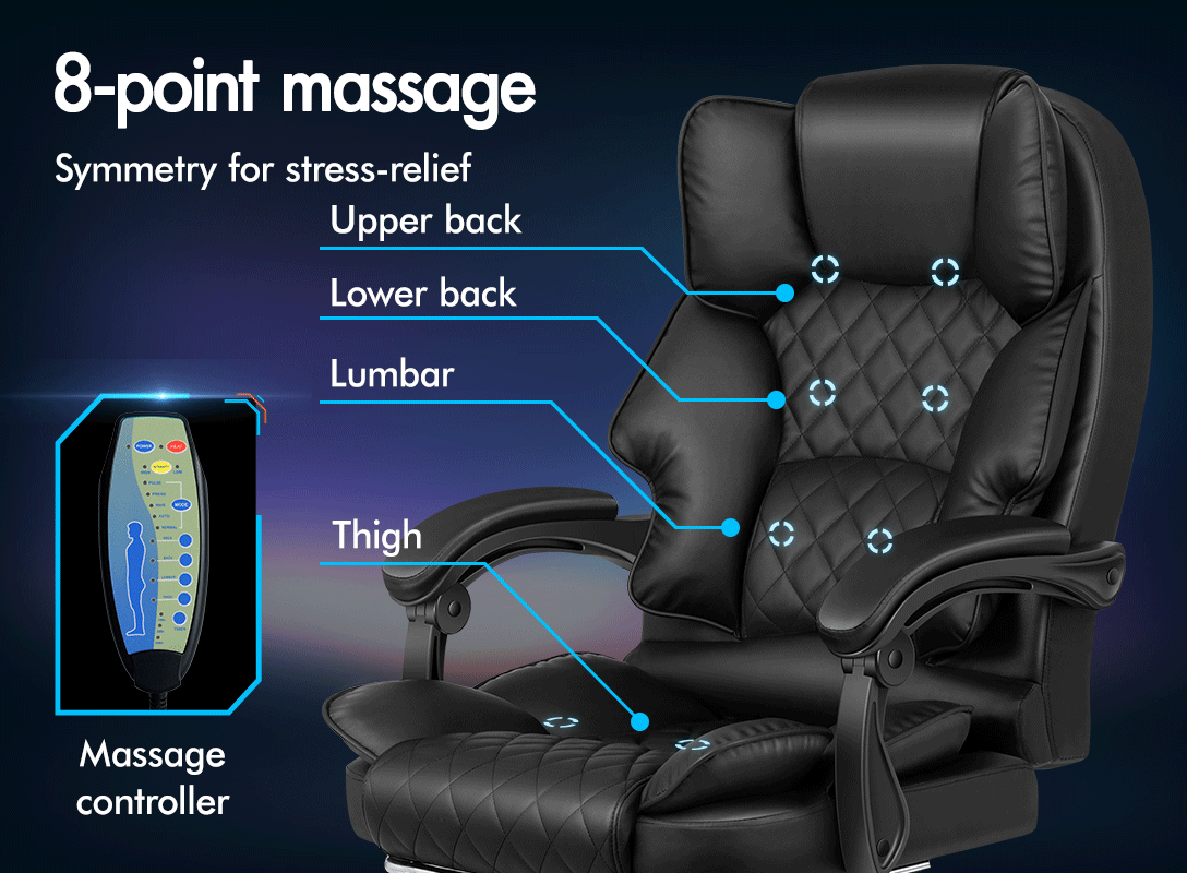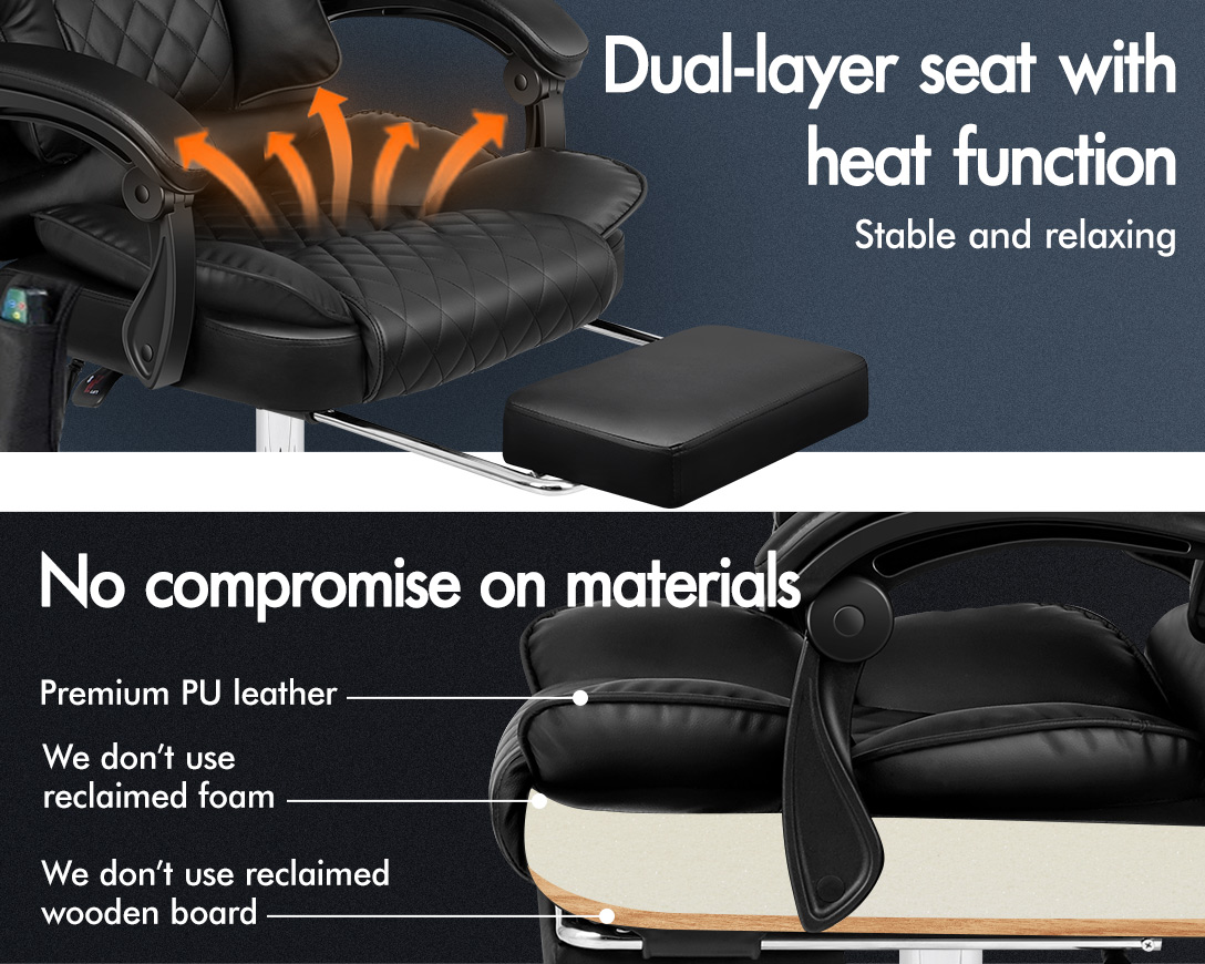 Crafted with innovation in mind, we upgraded the chair with 8 massage points and gentle seat heat function, allows you to work at your peak for long periods of time in optimal comfort. Built with premium PU leather, generous foam paddings and ergonomically-friendly design, our chair provides your entire body with ample support in all the right places. The chair perfectly combines both comfort and style.