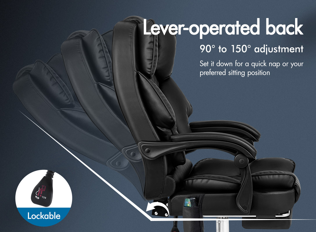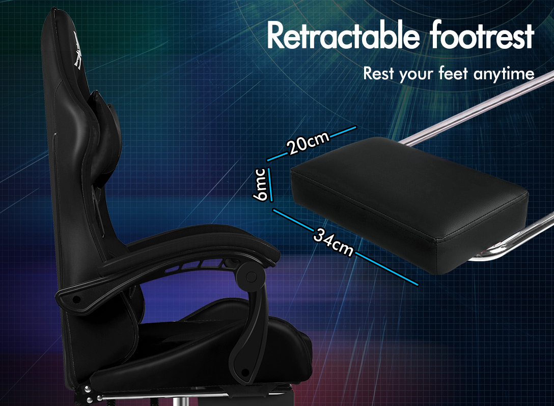The chair features 150 degree back recline adjustment and 360 degree swivel. You can lock the position of reclination as you wish. Combined with retractable padded footrest, it suits your personalized positions while sitting, sleeping or playing games. An elite in quality and design, your solution to true comfort.
