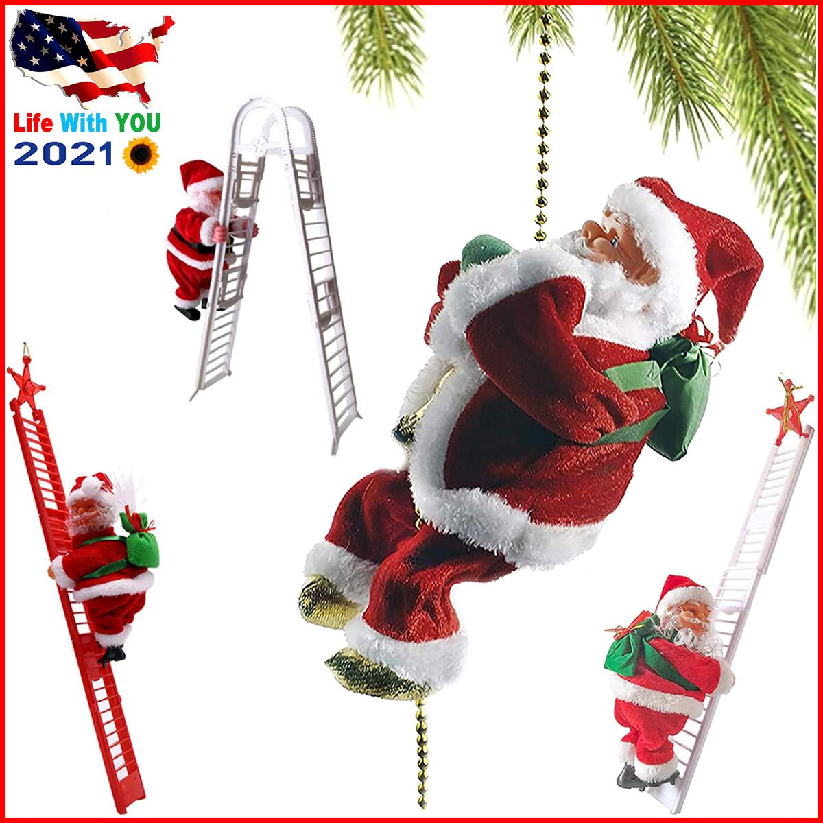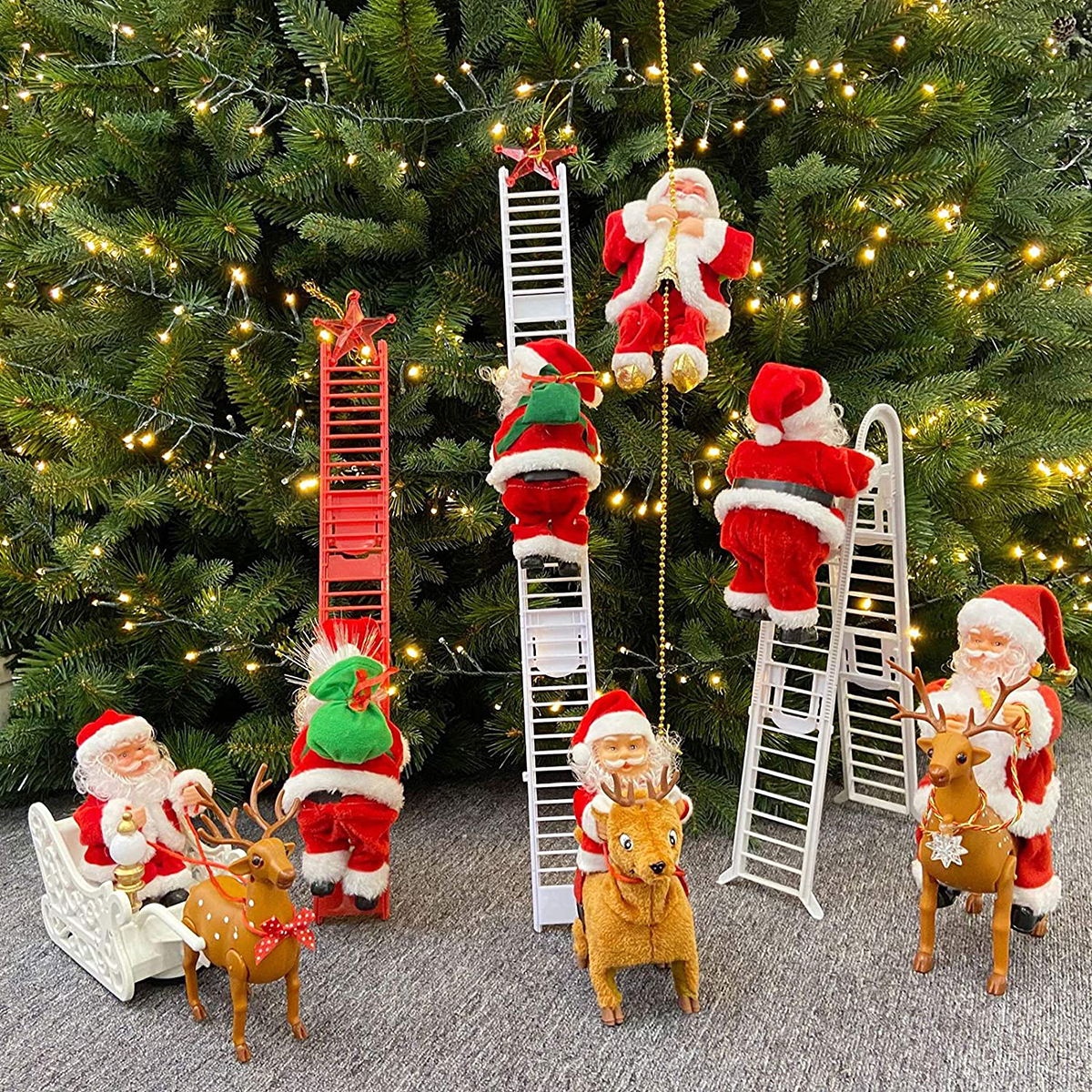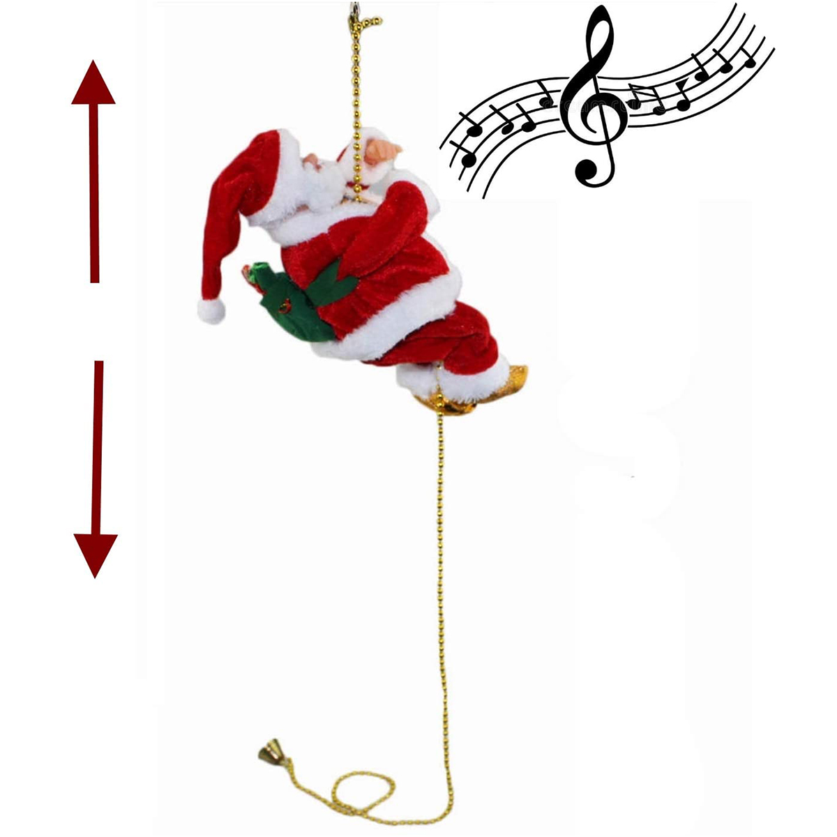 Animated Santa figure climbs up and down a 3 feet chain while playing Christmas spirited song/music.