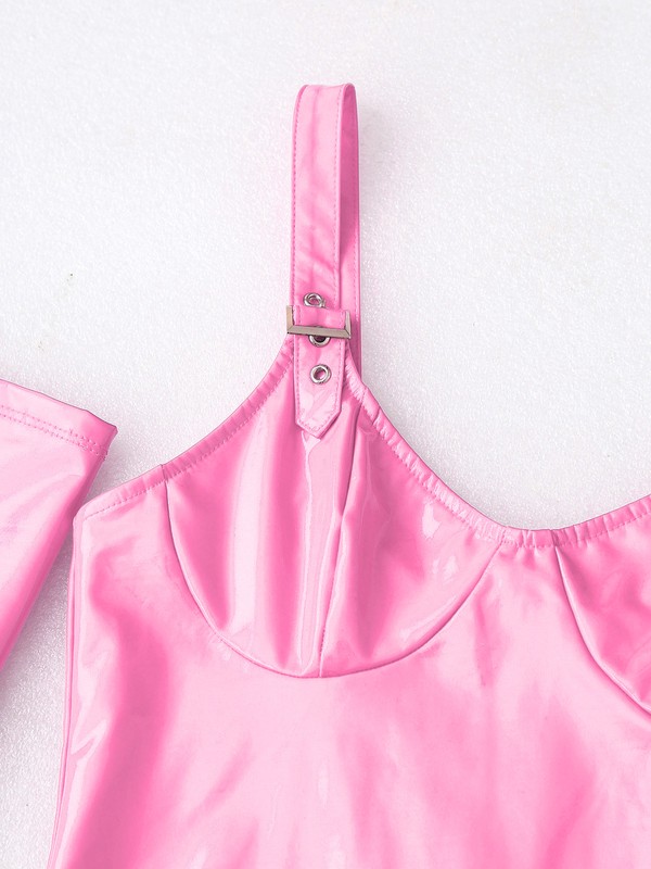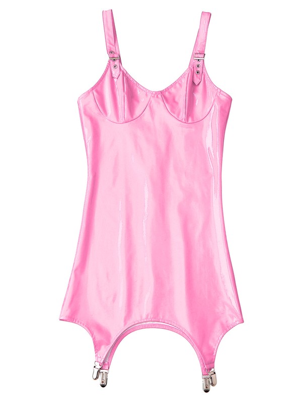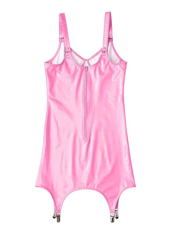 Attached with garter clips for holding stockings. Glossy surface, bringing wet look and enhancing your hourglass figure.