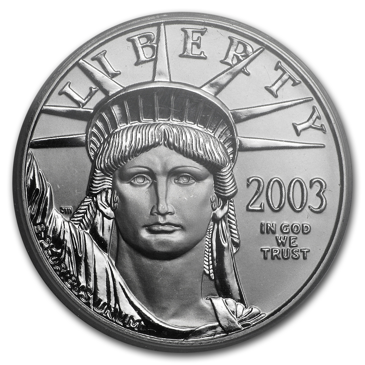- Obverse: The strong face of the statue below the word Liberty, with the year and In God We Trust to the side. E Pluribus Unum is engraved along Liberty's raised arm.