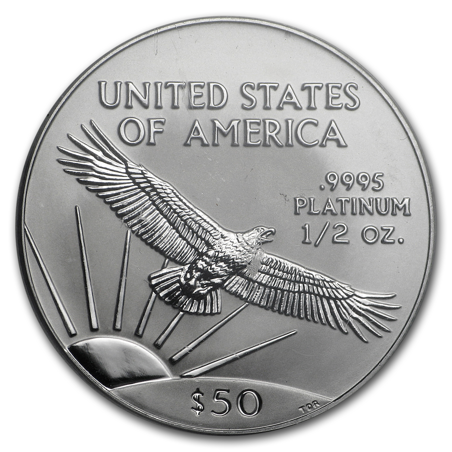 - Reverse: An American eagle with outstretched wings soaring in front of a sunrise with United States of America above. The weight, purity and $50 face value are also shown.