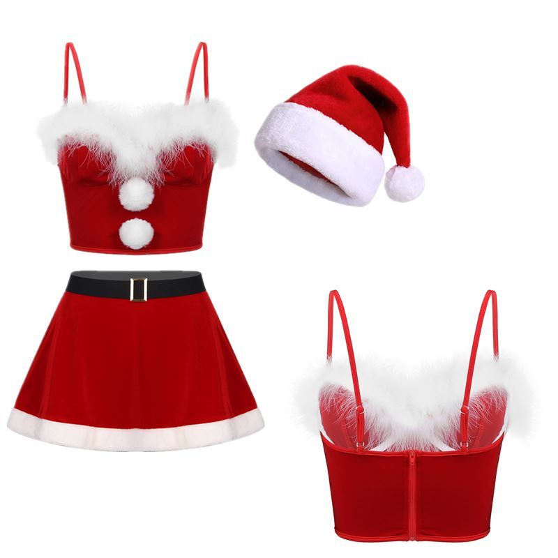 Underwired bra crop top with zipper on the back for easy wearing. Faux fur trimming and with two fuzzy balls on the front, looks cute and lovely.