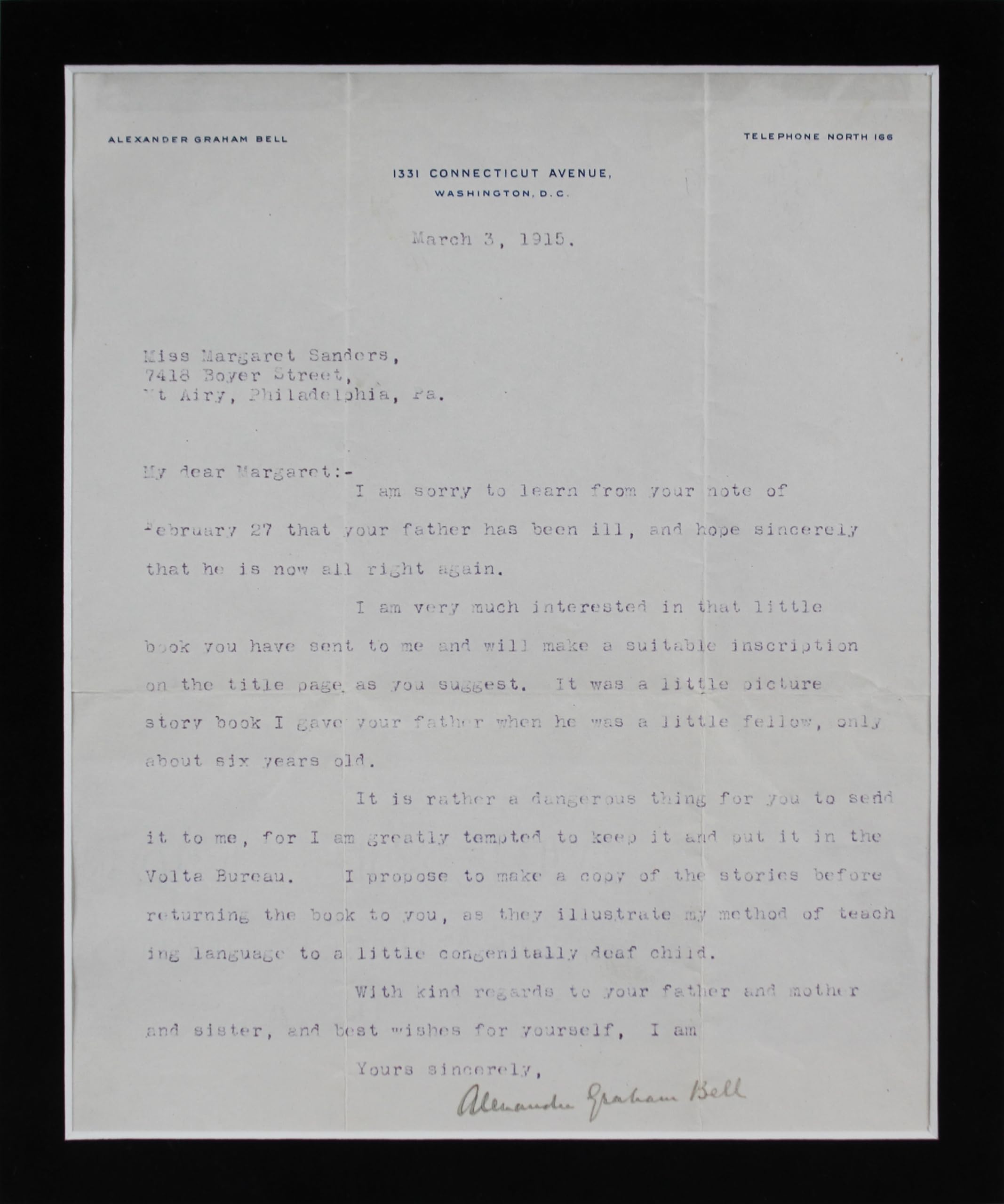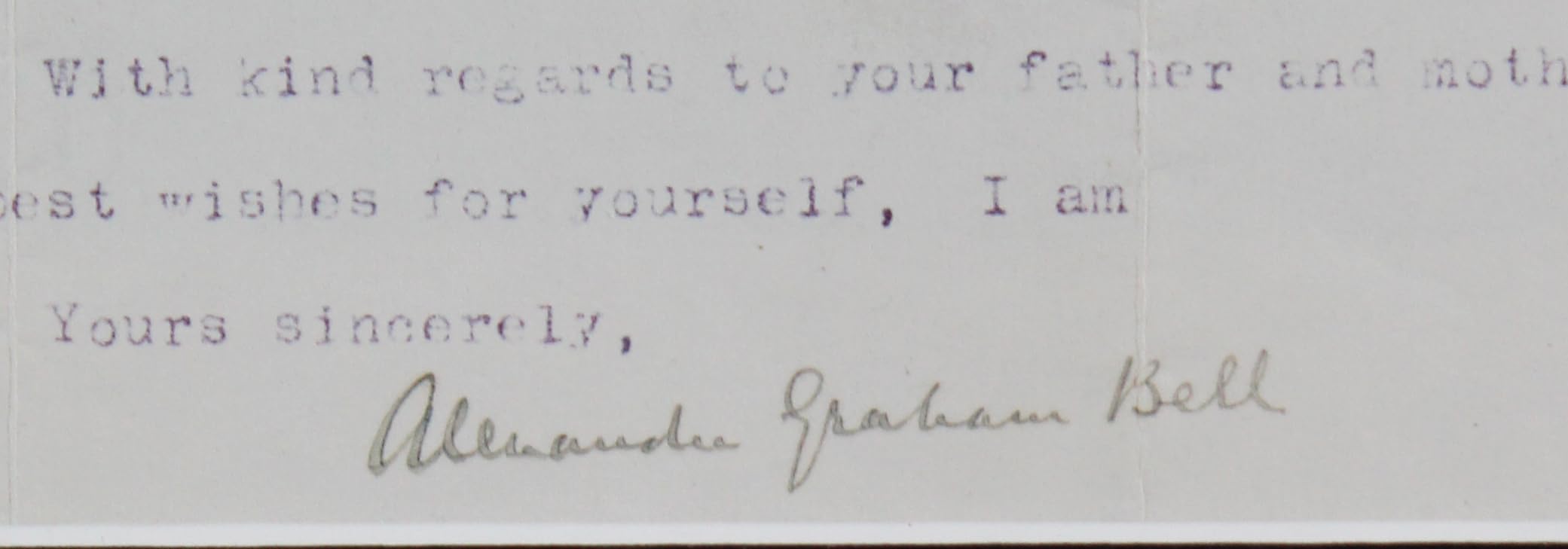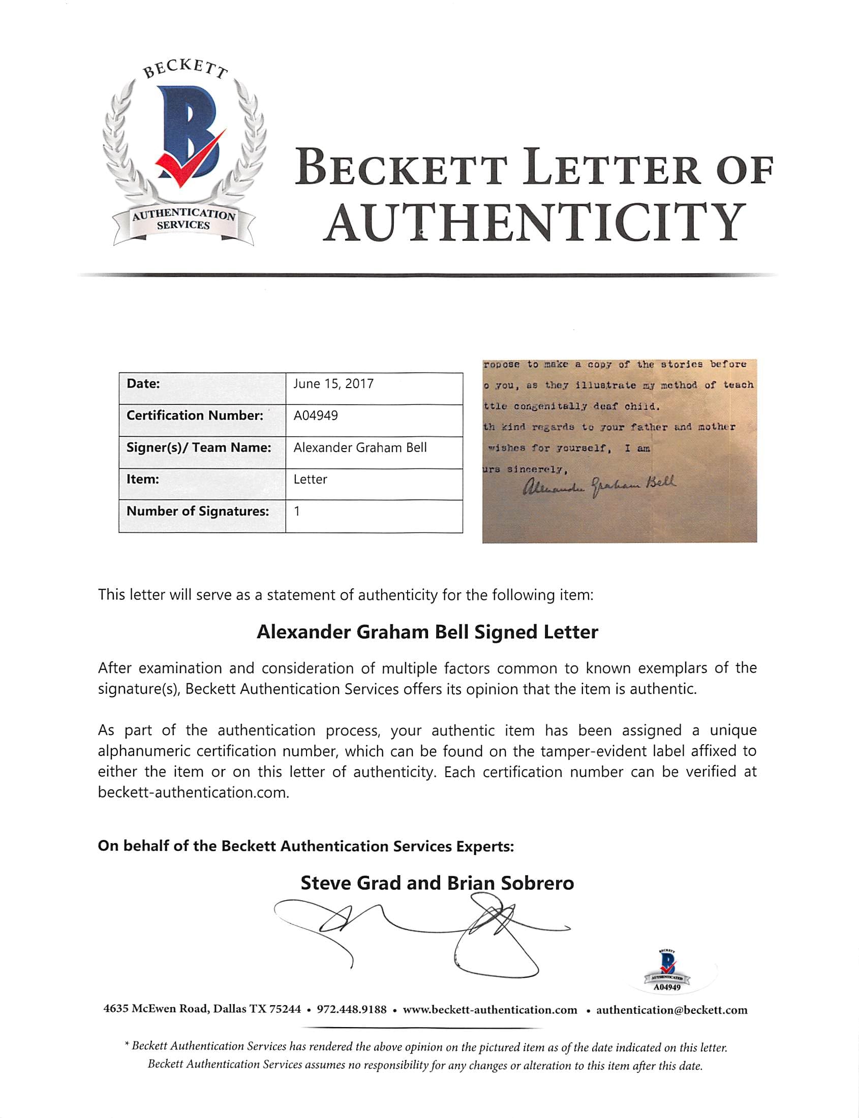 This Autographed Dated March 3, 1915 & Framed Typed Letter has been Personally Signed by Alexander Graham Bell. This item is 100% Authentic to include a Certificate of Authenticity (COA) / hologram by Beckett Authentication Services. The authenticity can be verified on Beckett Authentication Services website. This item has been professionally framed to overall dimensions of approximately 31 x 34.5 inches.