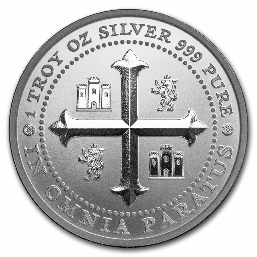 • Reverse: Depicts the design of a cross in the likeness of Spanish cob coins of the 16th-18th centuries. In each quadrant is a heraldic lion or castle.