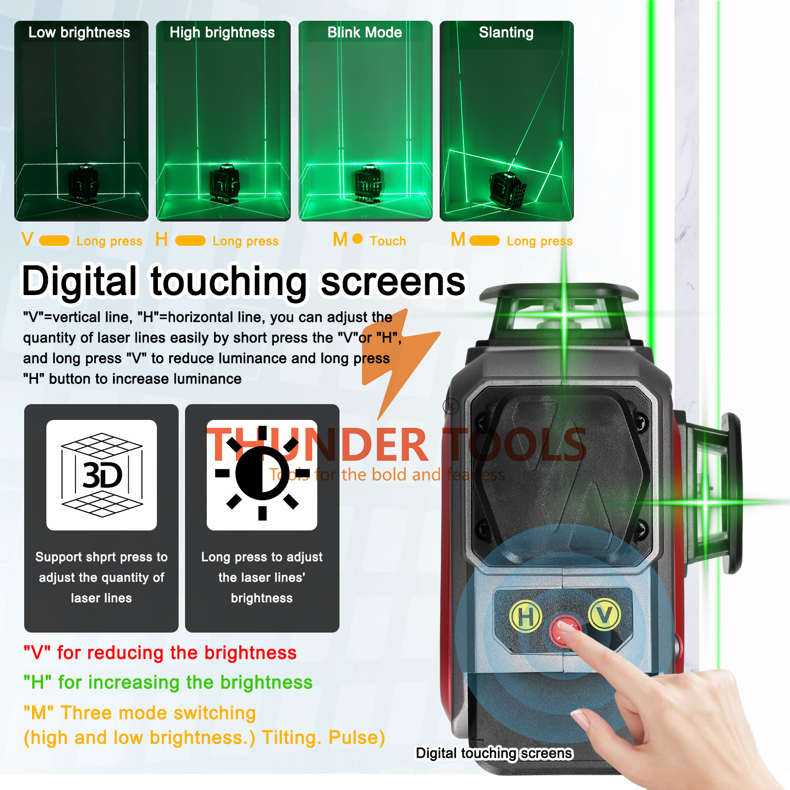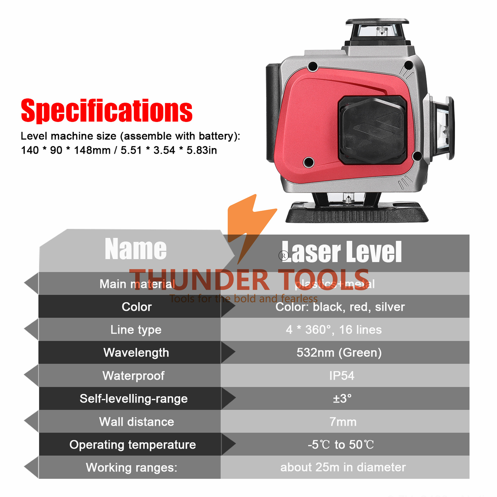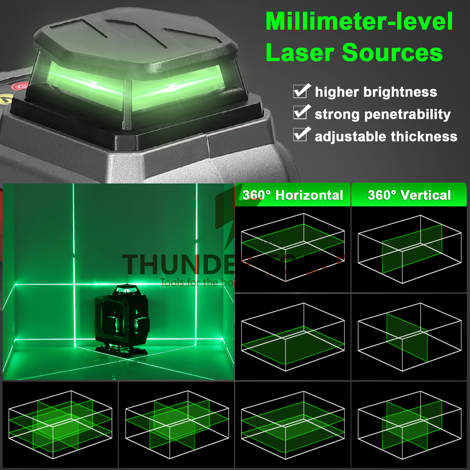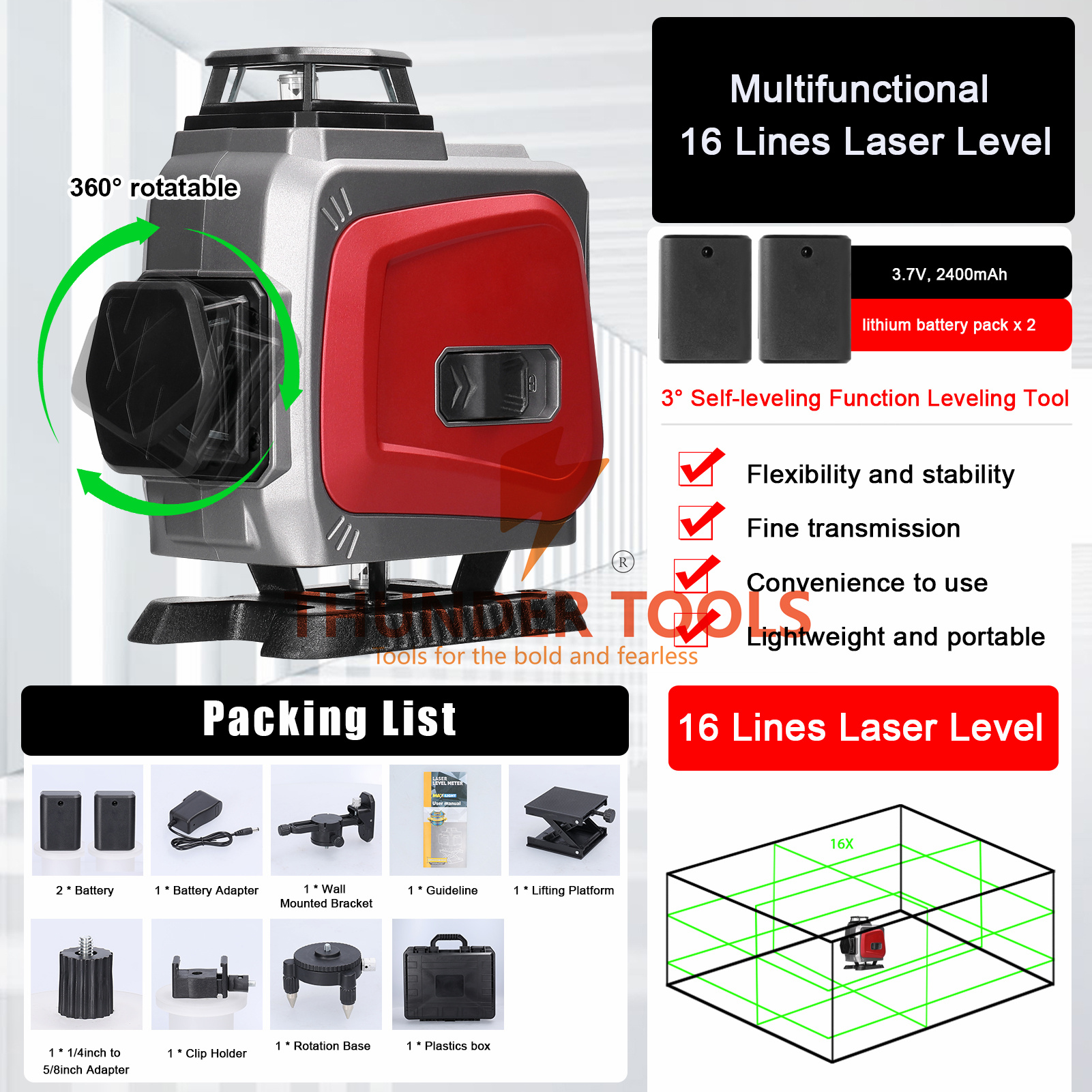 Thunder Tools Multifunctional 16 Lines Laser Level 3° Self-leveling Machine Rechargeable Lithium Battery Leveling Tool Omnidirectional Ground Wall Sticker Waterproof Home Improvement Tools Set