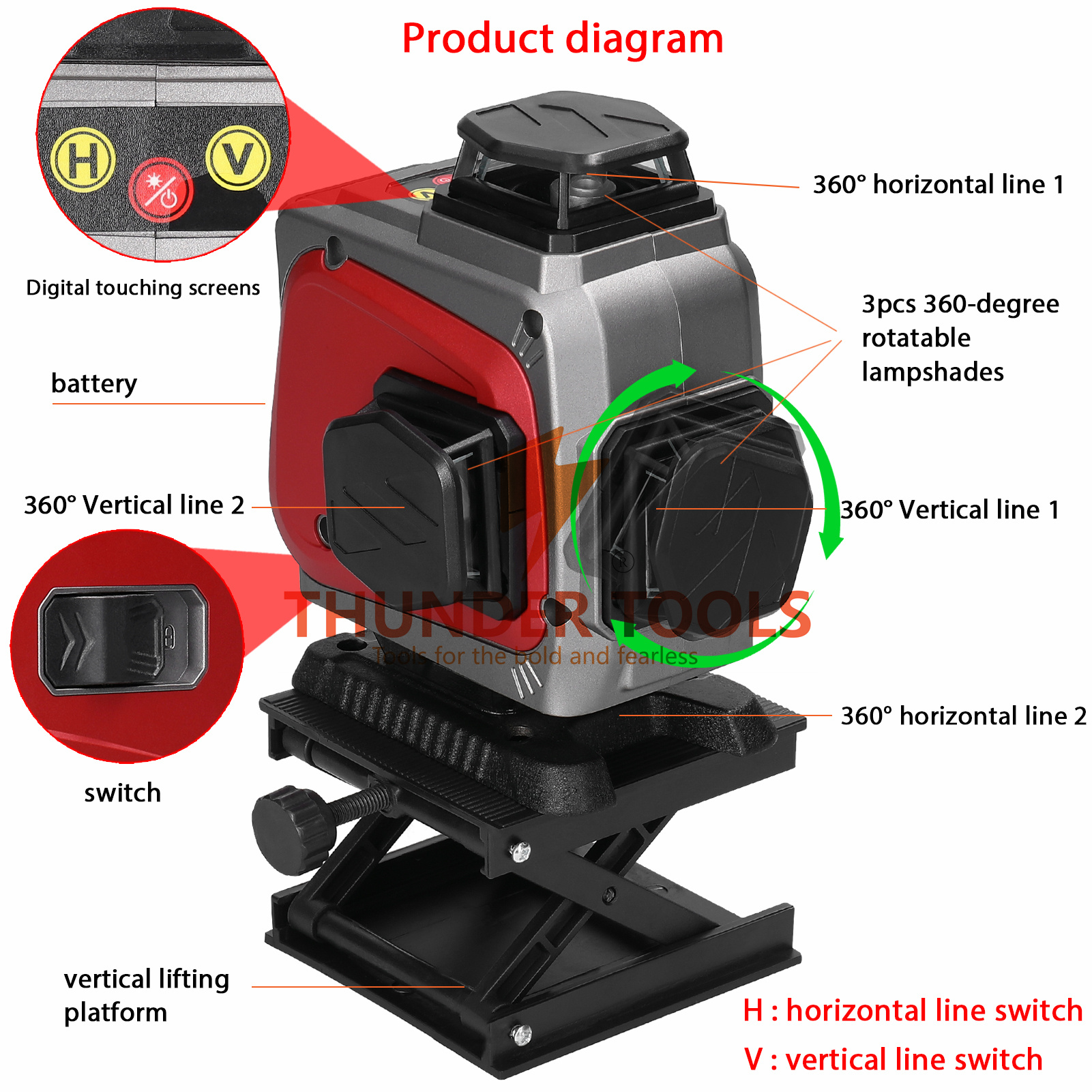 The laser level can emit 16 visible horizontal, vertical and inclined laser lines separately or simultaneously for automatic leveling. Equipped with self-test calibration function, ≤3° automatic leveling, but if the angle is over 3°, the laser light will keep flashing and the laser level will make a beep sound to remind you to reset them on a flat ground. It provides accurate horizontal and vertical data for indoor construction stakeout and calibration, easy to use and versatile. Suitable for floor tile layout, paneling, wallpapering, stenciling, wainscoting, finish carpentry, wall stud layout and partition installation. Features: 【Compact Size】: Lightweight and portable, long-lasting ABS housing makes this laser level perfectly shock resistant, wear-resistant and impact-resistant. IP54 waterproof and dustproof. 【Millimeter-level Laser Sources】: Using 4 high-precise millimeter-level green laser line laser sources, with higher brightness, strong penetrability, adjustable thickness, and brightness, the light is visible clearly both indoors and outdoors. The design of 3pcs 360-degree rotatable lampshades allows this laser level to measure in all directions, and also helps users to better observe and read measurements, without blind spots, which greatly improves the flexibility and convenience of use. 【Accurate Positioning】: One button power on/off. It can output 16 visible laser horizontal and vertical lines separately or simultaneously for finer positioning, with a 3° self-leveling system, high flexibility and stability. 【3° Automatic Leveling】: Equipped with self-test calibration function, ≤3° automatic leveling, but if the angle is over 3°, the laser light will keep flashing and the laser level will make a beep sound to remind you to reset them on a flat surface. 【Tilt Mode】: It has a tilt mode, you can place the laser tool at any angle to make tilt lines, the line will not flash and will not promote a beeping sound. 【Laser Quantity & Brightness Adjustable】: The touching panel is convenient for you to control the laser quantity and laser brightness, with high sensitivity line mode switching and line brightness adjustment. Support continuous laser and pulse laser, and also support pulse laser under tilt mode. "V"=vertical line, "H"=horizontal line, you can easily adjust the amount of laser lines by briefly pressing "V" or "H"; and long pressing "V" to decrease luminance and long pressing "H" to increase luminance. 【High Extensibility】: The bottom of the laser level is reserved with 1/4inch screw thread for easy connection, it can also be used with a tripod (not included) by 1/4inch to 5/8inch threaded rotation base (included) or 1/4inch to 5/8inch adapter (included) to adjust the working height of the machine. 【7mm Wall-mounted Bracket】: The T-shaped bracket with 7mm wall mounting distance, which has 360° rotatable fine adjustment mechanism, up and down angle regulation and 47mm fore-and-aft regulation distance, all the structures can make the machine quickly find the target (1/4 inch screw size). 【Plastics Lifting Platform】: The laser level lifting platform is height adjustable design, max 65mm adjustment ranges, anti-slip texture design for increasing friction, more stable placement. 【Window Clip】: There is a window clip holder for working with the wall-mounted bracket, with 26-40mm wide clamping ranges, suitable for a variety of laser levels. 【Carrying Box】: Comes with a plastics box, wear resistant and impact resistant, easy to carry, providing quick and convenient mobility and storage in a complex environment. Note: Please do not let the laser line shoots your eyes directly, and do not stare directly at the laser light. Do not disassemble the instrument and perform your own internal repairs. The instrument meets laser radiation safety rating standards. Specifications: Name: Laser Level Main material: plastics+metal Battery: 2 * rechargeable lithium batteries, 3.7V, 2400mAh (included) Line type: 4 * 360°, 16 lines Wavelength: 532nm (Green) Self-leveling angle: ±3° Wall mounted distance: 7mm Operating temperature: -5℃ to 50℃ Working ranges: about 25m in diameter Waterproof: IP54 Level machine size (assemble with battery): 140 * 90 * 148mm / 5.51 * 3.54 * 5.83in Wall-mounted bracket size: 160 * 90 * 75mm / 6.30 * 3.54 * 2.95in Rotation base size: 95 * 83 * 75mm / 3.74 * 3.27 * 2.95in Lifting platform size: 113 * 91 * 29mm / 4.45 * 3.58 * 1.14in Clip holder size: 63 * 24 * 26mm / 2.48 * 0.94 * 1.02in 1/4inch to 5/8inch adapter size: 22 * 22 * 32mm / 0.87 * 0.87 * 1.26in Plastics box size: 337 * 280 * 135mm / 13.27 * 11.02 * 5.31in Package weight: 1955g / 4.31lb Packing List: 1 * Level Machine 2 * Battery 1 * Battery Adapter 1 * Rotation Base 1 * Wall Mounted Bracket 1 * Lifting Platform 1 * Clip Holder 1 * 1/4inch to 5/8inch Adapter 1 * Guideline 1 * Plastics Box |