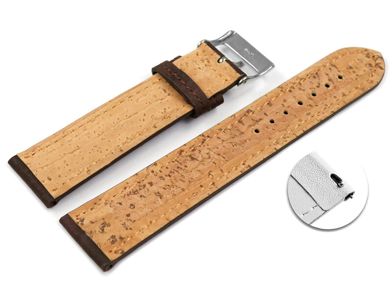 Veganes Schnellwechsel Uhrenarmband in dunkelbraun aus Natur-Kork leicht gepolstert mit Naht in 14mm, 16mm, 18mm, 20mm und 22mm. Ideal für DAU (Damenarmbanduhr) und HAU (Herrenarmbanduhren) geeignet.