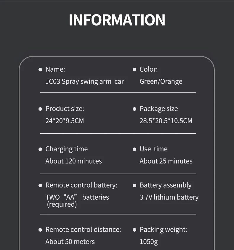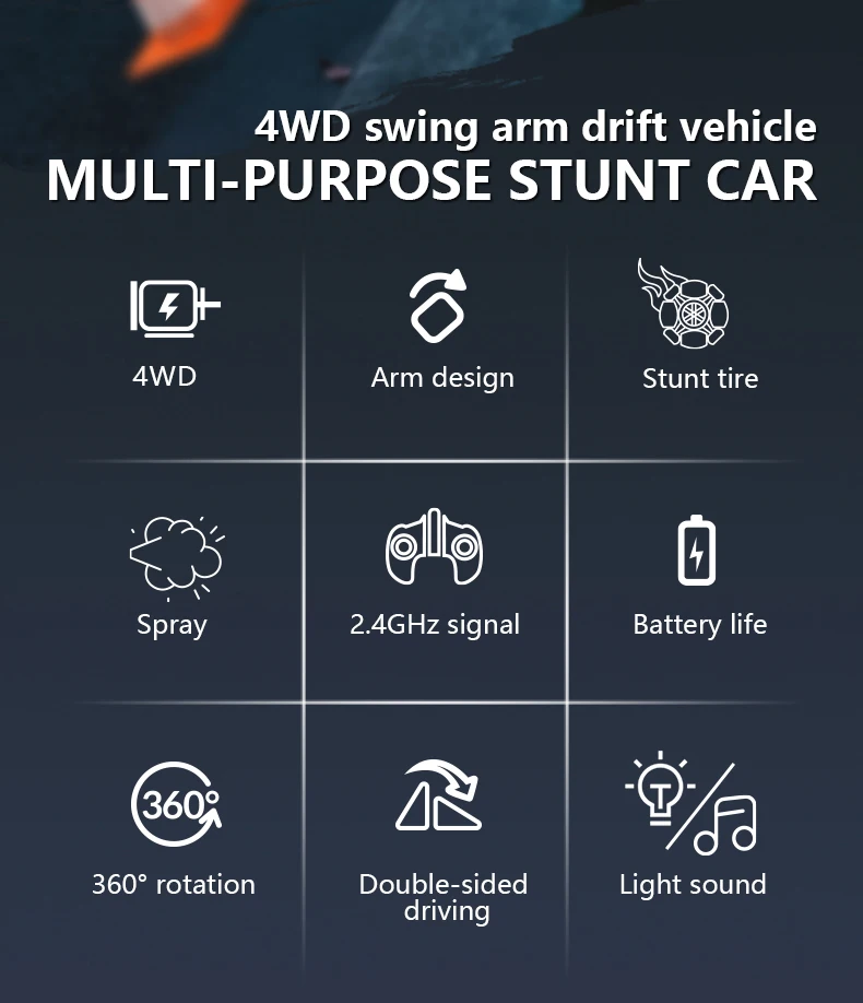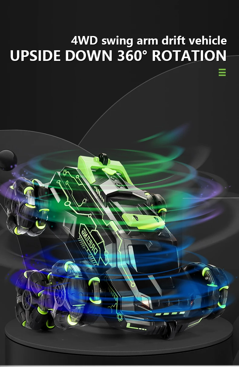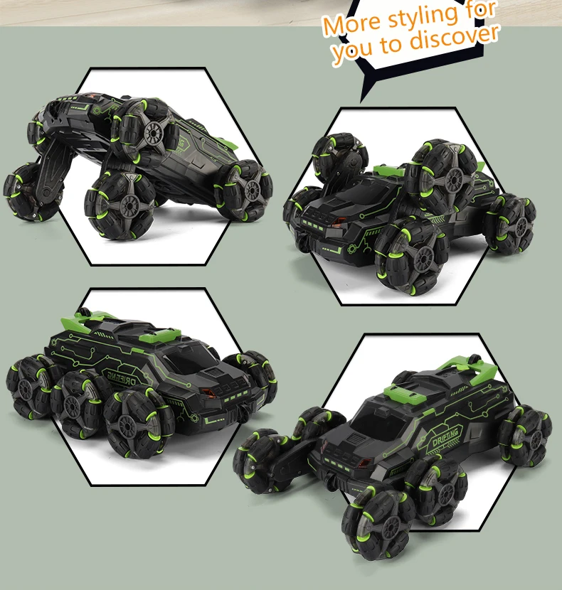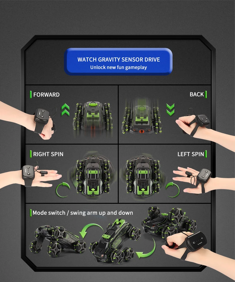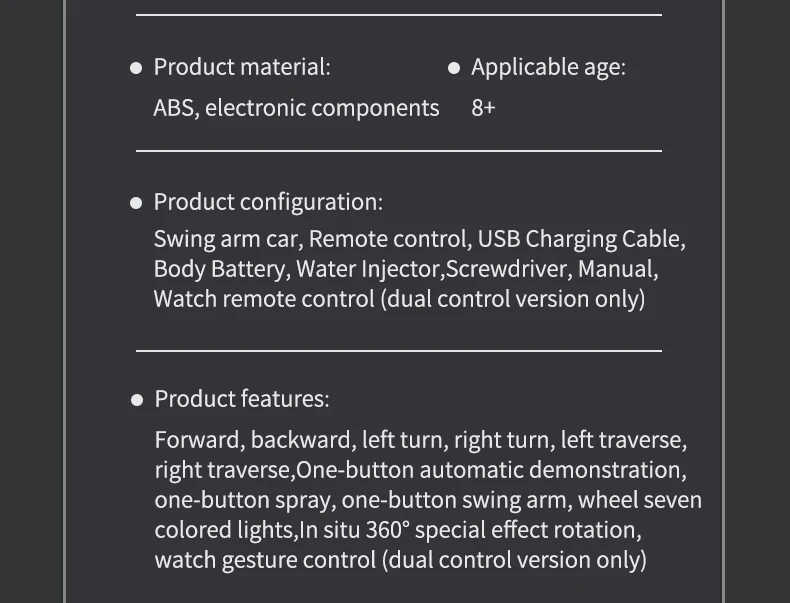 Forward, backward, left and right drift, colorful lights, music, spray, swinging arm climbing, inverted walking, 360 ° rotation, reverse walking, gesture control