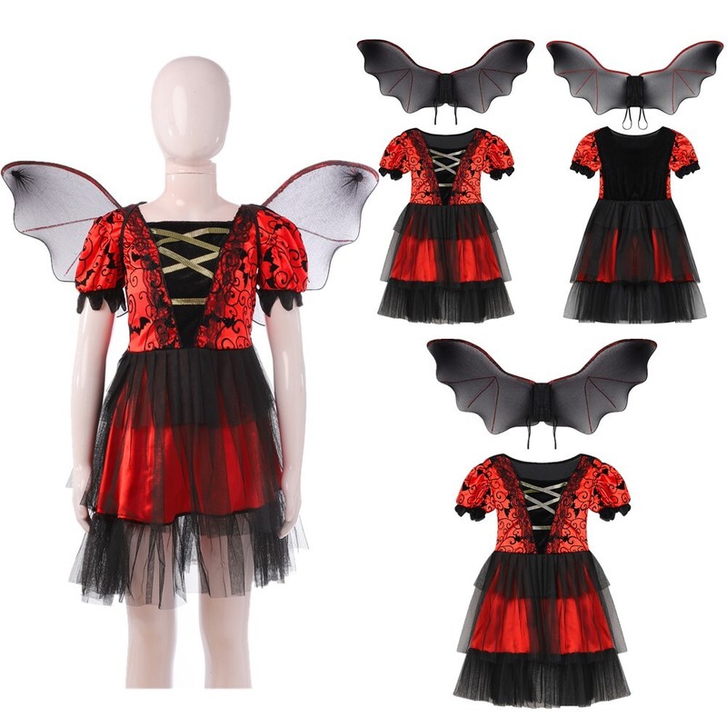 Kids Girls Halloween Witch Cosplay Costume V Neck Long Sleeves Irregular Hem Mesh Dress with Belt.