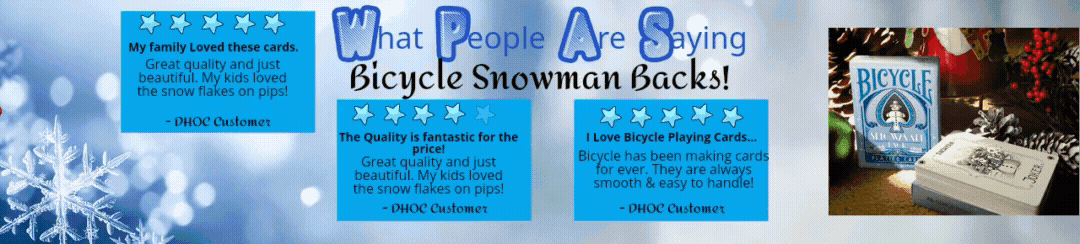 Description: Introducing our unique Christmas creations, the Snowman Back Red & Green Bicycle Playing Cards. Our aim was to encapsulate the cherished moments of childhood Christmases spent with family. With this vision, we've crafted what we foresee as the benchmark for Christmas deck card designs: the Snowman Back. Inspired by the iconic Rider Back design, the Snowman Back radiates the playful and joyful essence of yuletide memories from our youth. Key features: