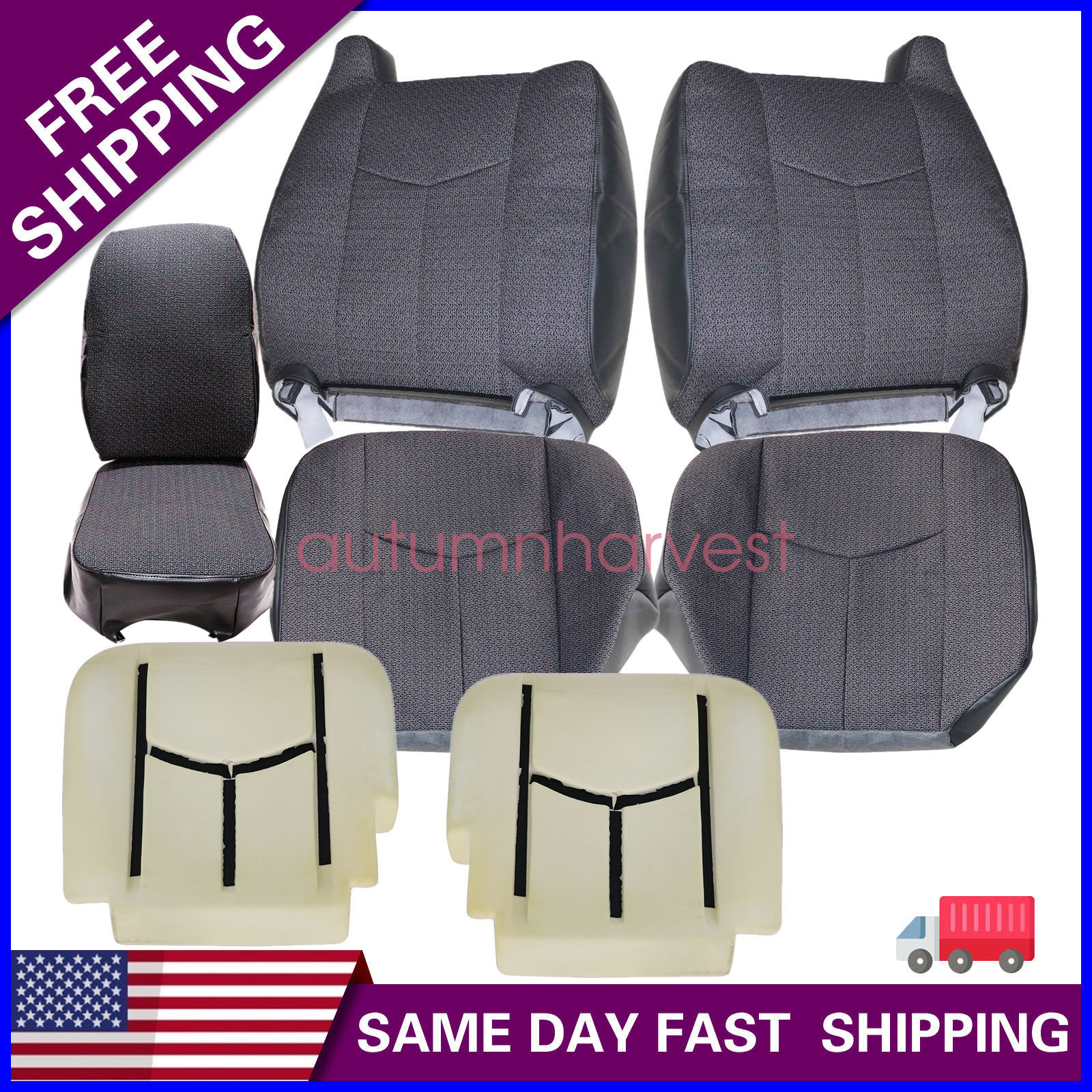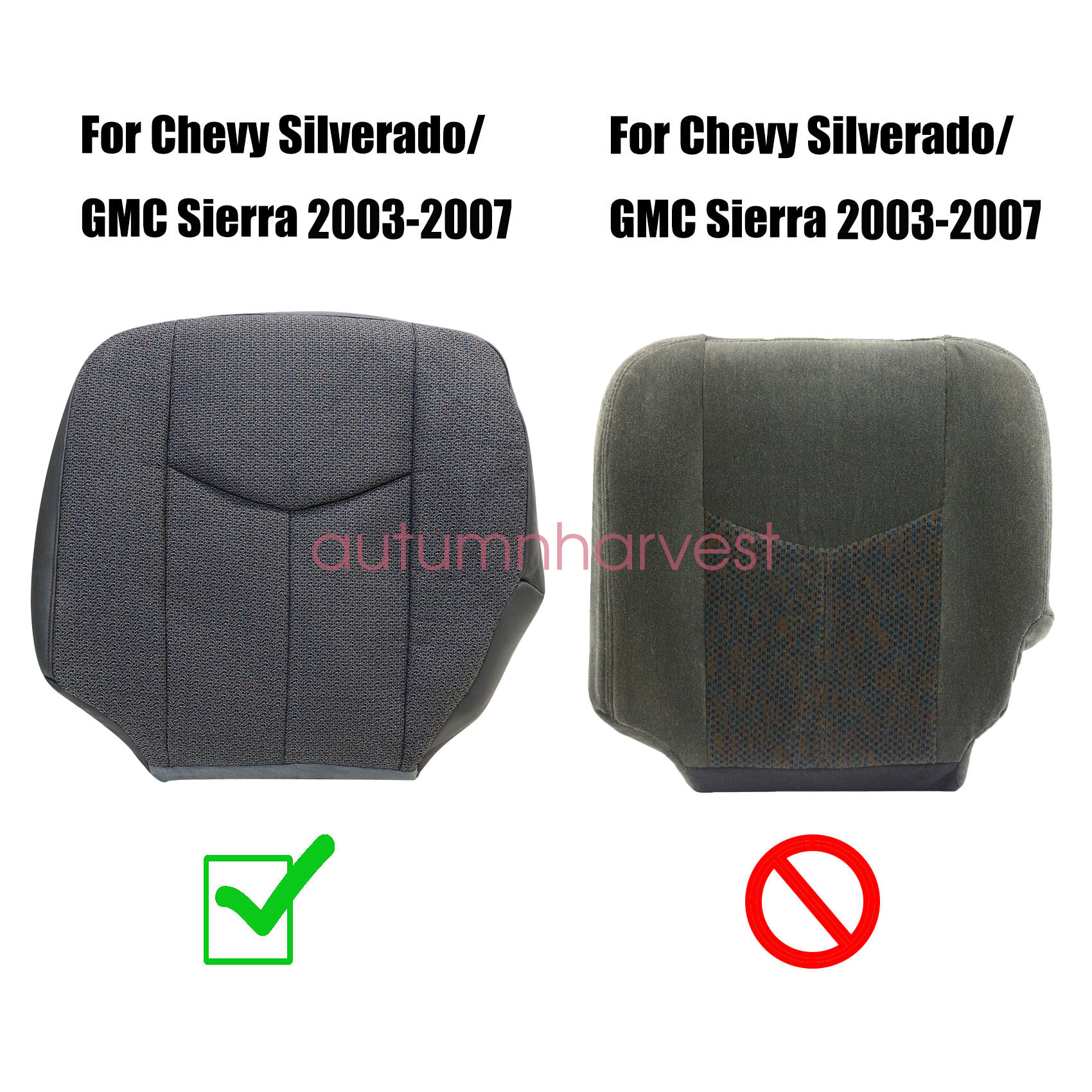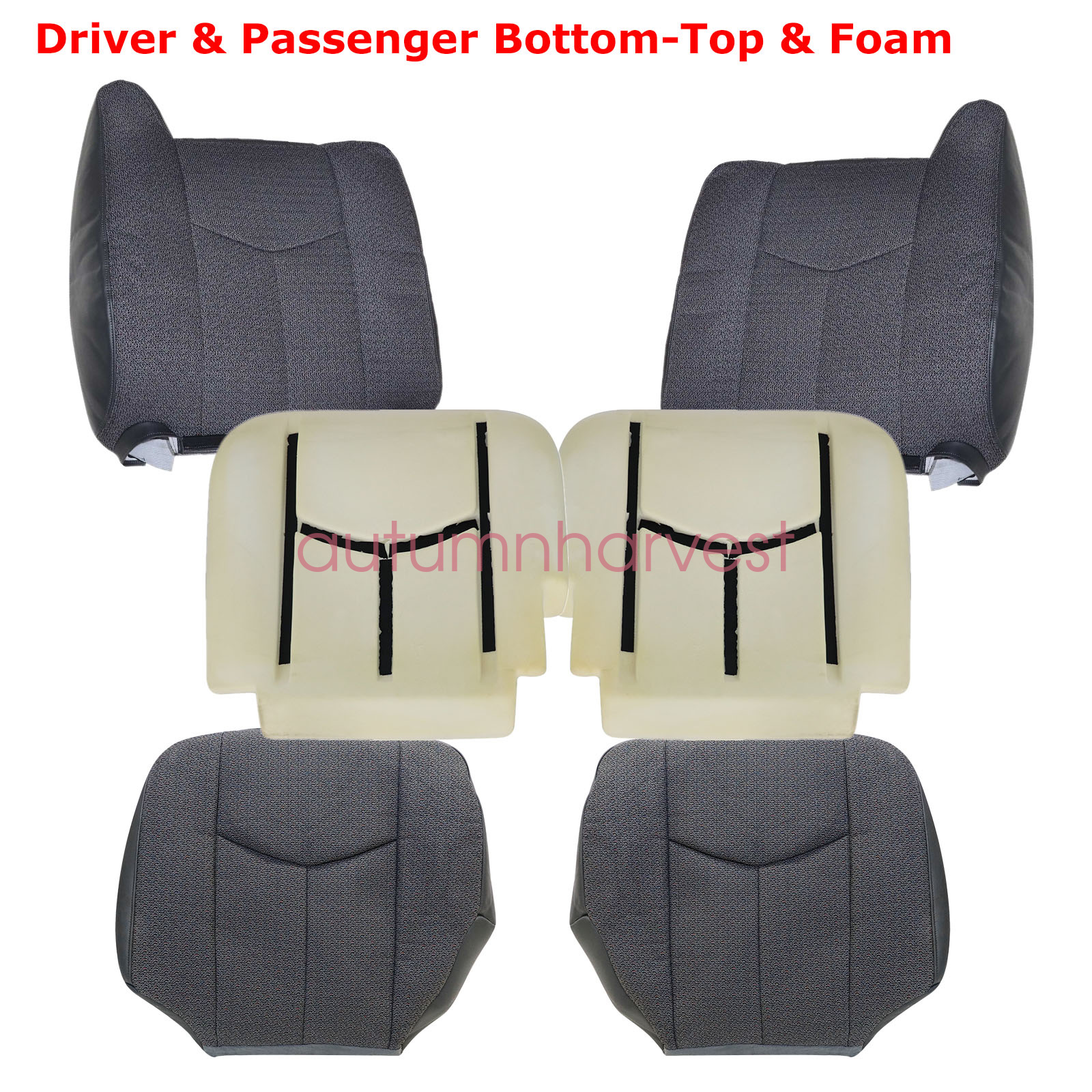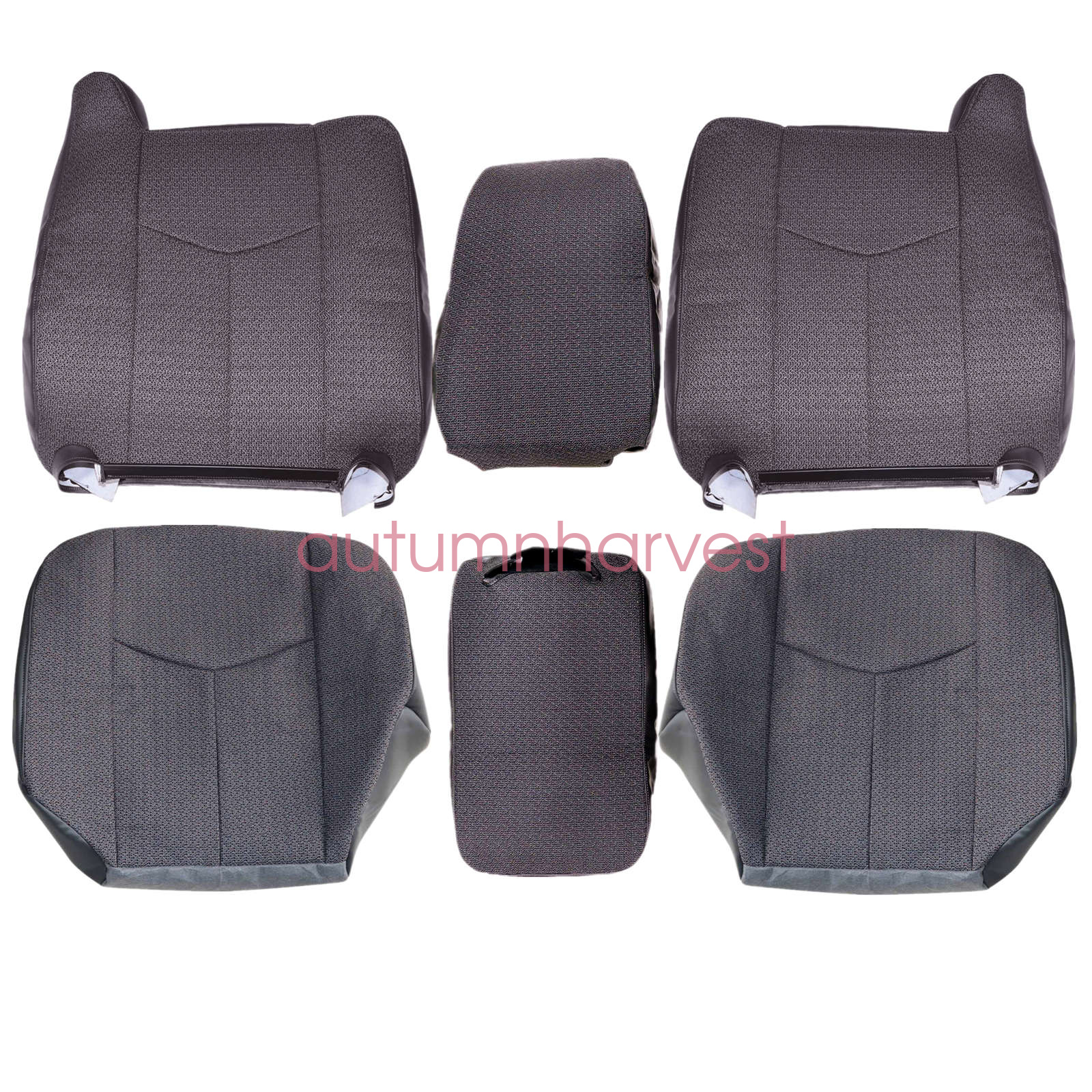 This item is a new custom-made, OEM replacement, in OEM color and Texture For 2003 to 2007 GMC Sierra and Chevy Silverado Driver / Passenger Side Bottom Replacement Cloth Seat Covers in Dark gray with trim color code 69C