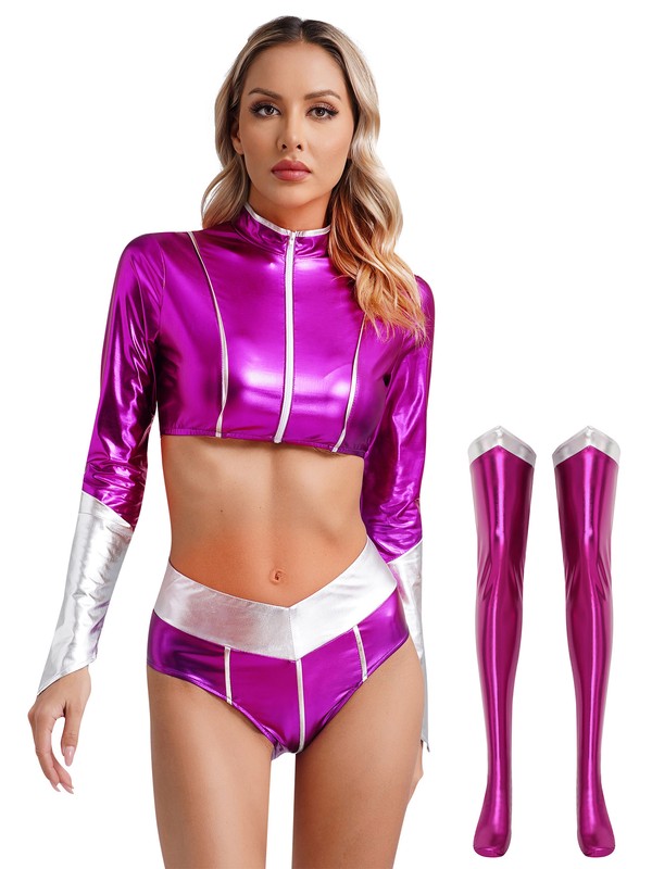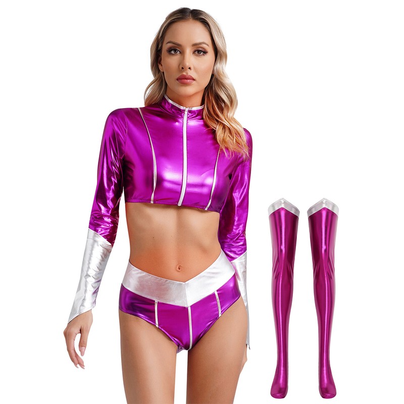 Designed with stand collar, long sleeve with sword-shaped cuffs, front zipper; matched with high waist briefs shorts and a pair of stockings.