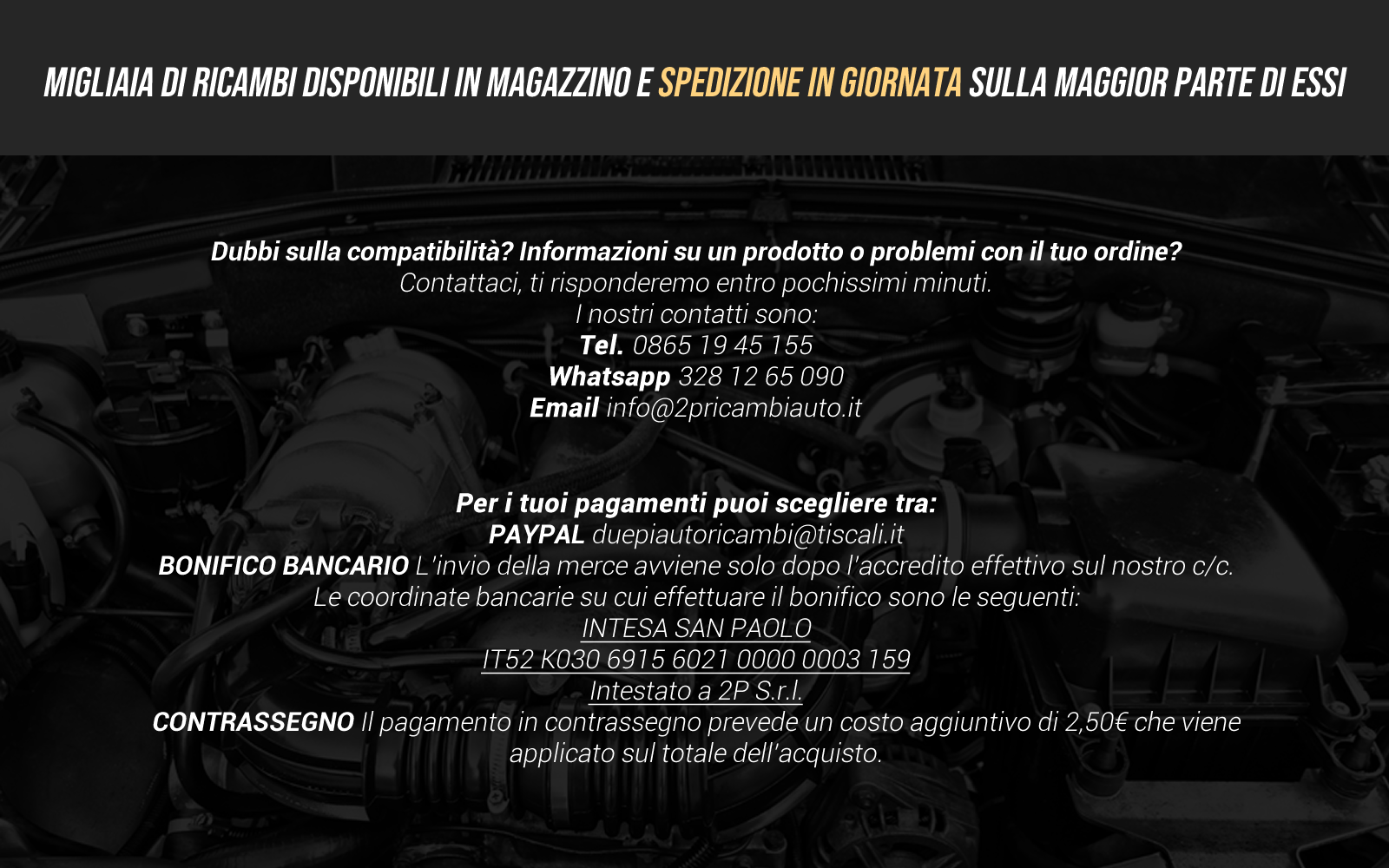 La compatibilità che indica ebay è, il più delle volte, puramente indicativa pertanto l'unico modo per essere certi che il ricambio acquistato sia quello corretto per la tua vettura è quello di fornirci il numero di targa o di telaio al momento dell'acquisto.