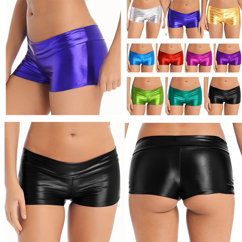 PU leather booty shorts for women, solid color, pull on closure, the triangular design will visually prolong your legs.