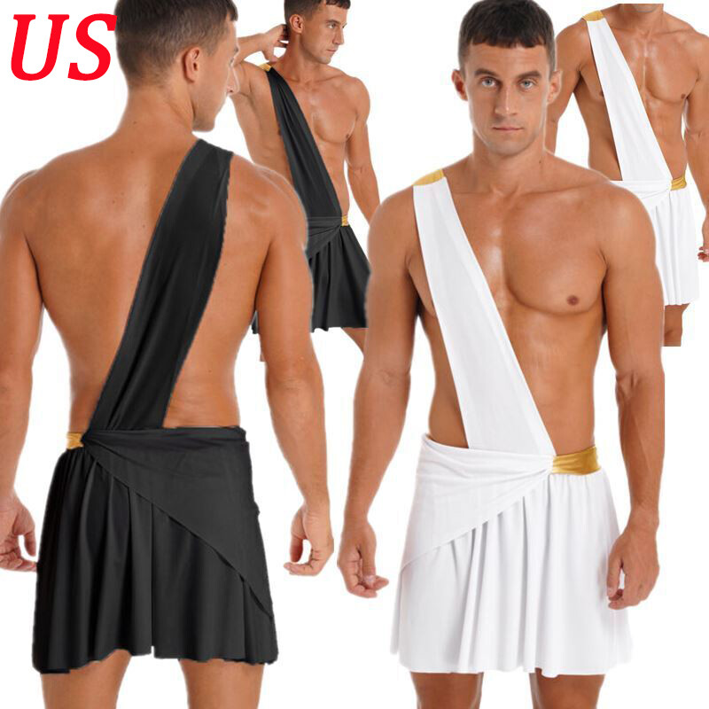 Ancient Egypt dress for men, contrast color, metallic shiny front drape, asymmetrical hem design. Match with a pair of cuffs.