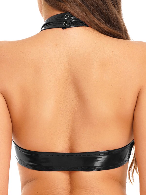 Crop top designs with halter neck with 2 press buttons closure, sleeveless, backless and O-ring decoration, making you hot and sexy.