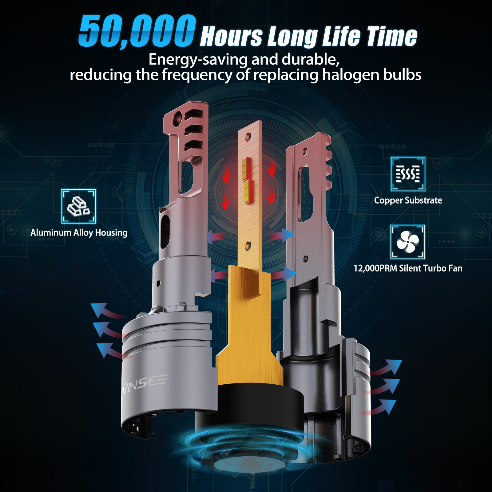 【Faster Cooling】Heat generated on the light can be swept away quickly thanks to our patented aluminum construction, pure copper substrate and 12,000RPM silent turbo fan design, which makes its service life up to 50,000hrs.