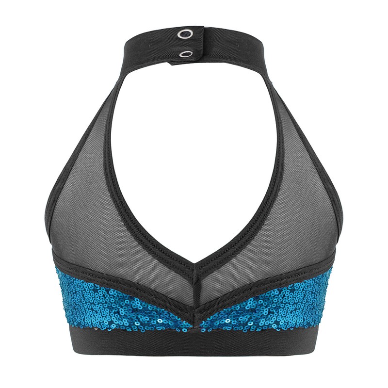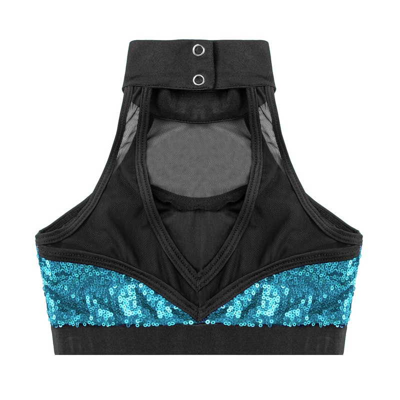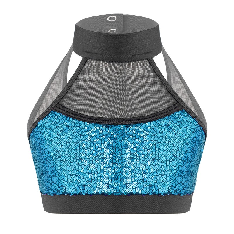 The crop top features with sleeveless and stand collar, shiny sequins and spandex mesh patchwork style, big hollow back.