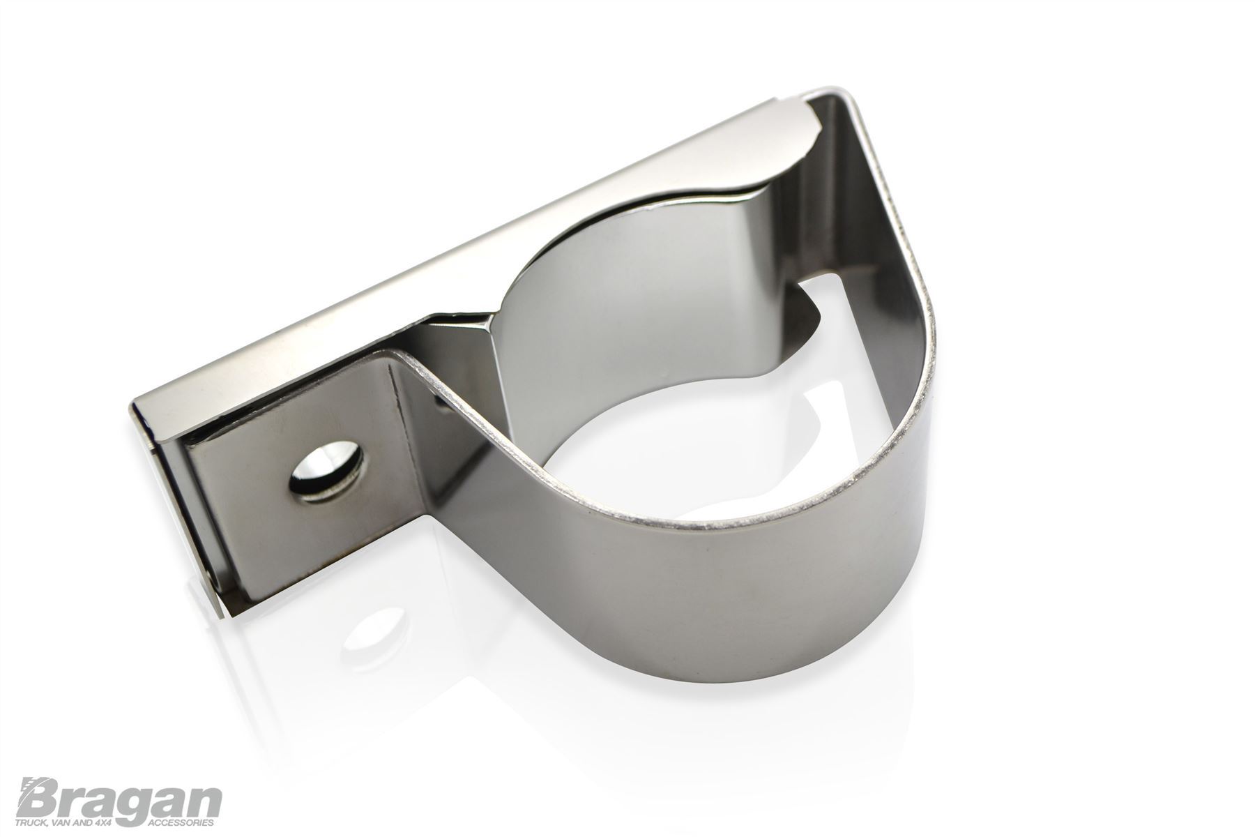 High quality Stainless Steel Spot Light Bracket Clamps 1x for mounting spot lights to truck light bars, abars, bullbars, roll bars or any other tubular type bar you wish to mount lights or beacons to. These are hand polished stainless steel made to a very high standard. These will fit to 63 mm tube (standard truck light bar size).